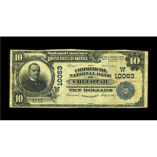 <B>Checotah, OK</B></I> - $10 1902 Plain Back Fr. 628 <B>The Commercial NB</B></I> Ch. # (W)10063<BR>A tough Checotah bank which lasted for less than a decade before bowing out in 1921. Just four notes comprise the entire census, with this example as nice as any listed. <B>About Fine.</B></I><BR><BR><b>Shipping:</b> Coin/Currency (<a target="_blank" href="http://www.heritageauctions.com/common/shipping.php">view shipping information</a>)