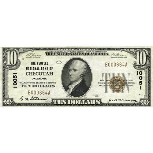 <B>Checotah, OK</B></I> - $10 1929 Ty. 1 <B>The Peoples NB</B></I> Ch. # 10051<BR>This piece is listed in the census as CU, which it certainly appears until very closely examined. <B>Extremely Fine-About Uncirculated,</B></I> and as nice as any Series 1929 specimen we've ever seen.