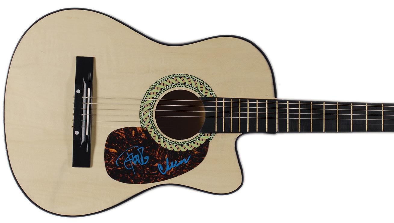 Natural wood-finish six-string acoustic guitar, signed on the pickguard in blue ink by Cheech [Marin] and Tommy Chong. In fine condition. Oversized.