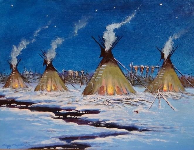 Cheek, C. R., oil, Indian Winter Camp, 12" x 14", Clifton Ray Cheek, a resident of Northeastern Montana, was raised on Montana's Fort Peck Indian Reservation. He was born in Kentucky in 1937, and became keenly interested in the tradition of pioneer and Indian life in the Old West when he moved to the reservation. Mr. Cheek honed his artistic skills through hands-on experience, exposure to the Native environment of the Sioux-Assiniboine nations and the rigors of ranching. His early works consisted of pen and ink drawings, watercolors and oil paintings.