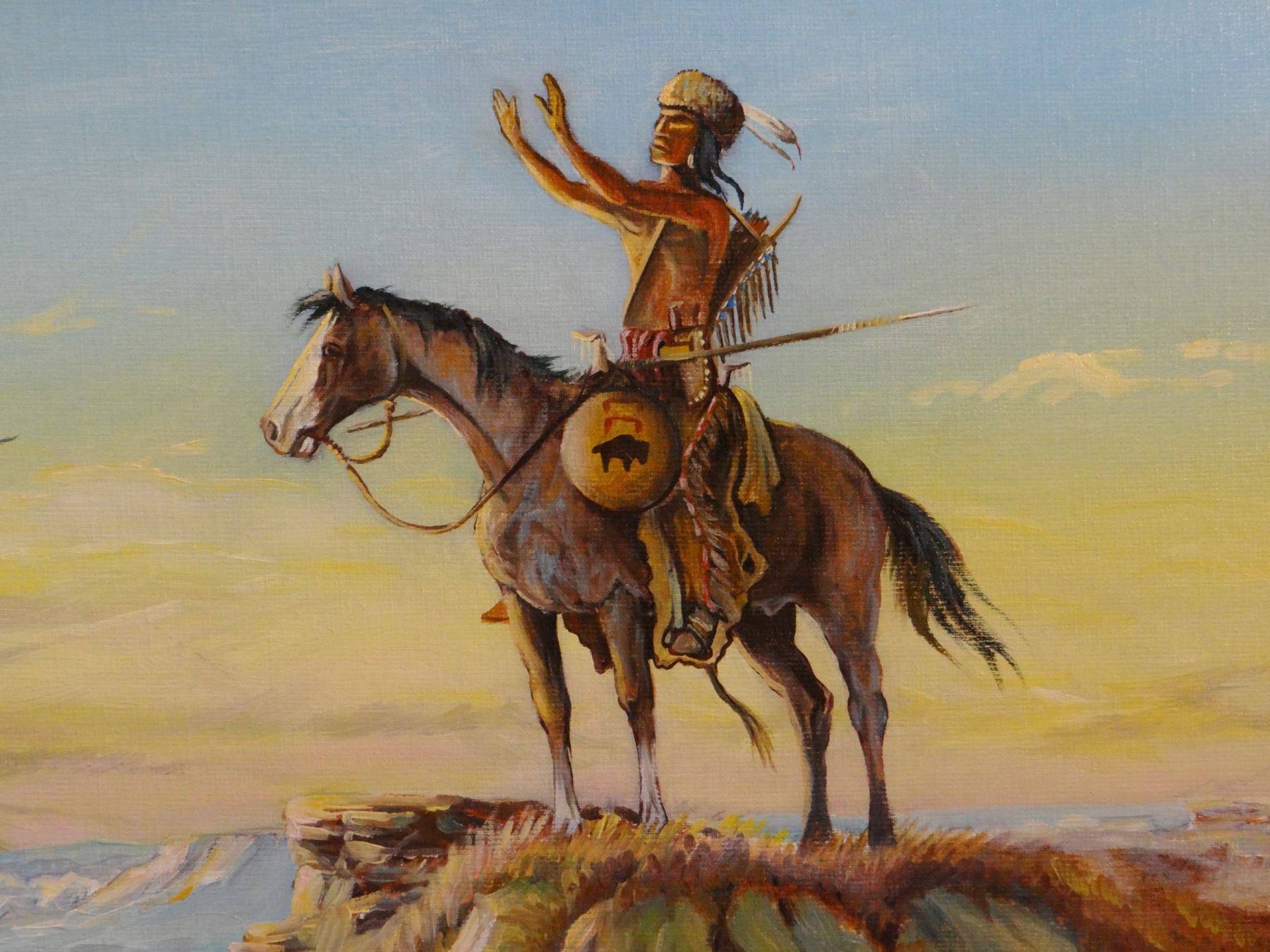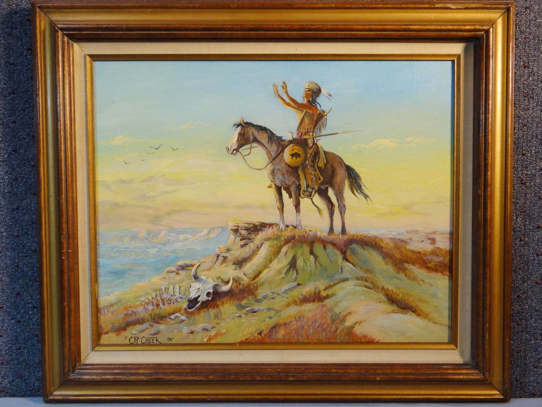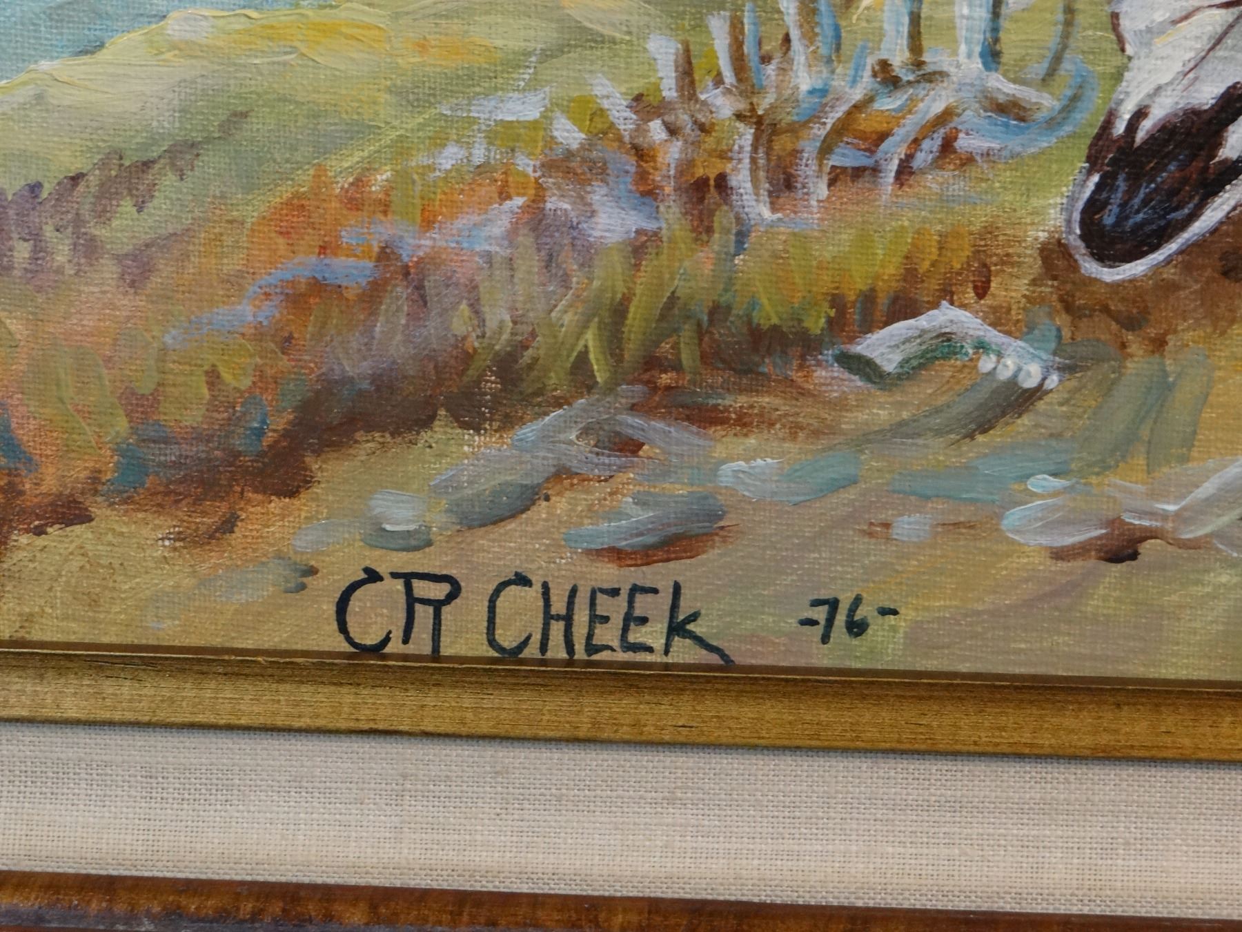 Cheek, C. R., oil on canvas, Praying Northern Plains Warrior, 18" x 22", 1976.Clifton Ray Cheek, a resident of Poplar, Montana, was raised on Montana's Fort Peck Indian Reservation. He was born in Kentucky in 1937, and became keenly interested in the tradition of pioneer and Indian life in the Old West when he moved to the reservation. Mr. Cheek honed his artistic skills through hands-on experience, exposure to the Native environment of the Sioux-Assiniboine nations and the rigors of ranching. His early works consisted of pen and ink drawings, watercolors and oil paintings.