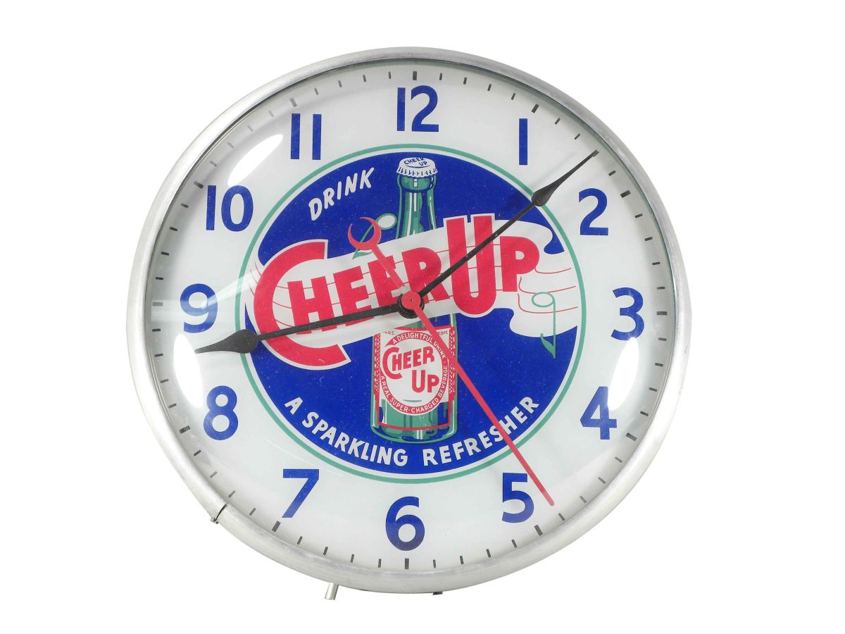 Cheer Up Soda Clock. Excellent working condition. 15 inch diameter, convex glass.