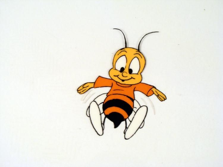 Cheerful bee * * * Original Animation Cel * * Medium: Hand painted acetate celCel size: 10 1/2 x 12 1/2 inchesDetails: Number and peg holes at the bottom edgeCondition: Very good * This is an original hand-painted cel set-up used in the production of an episode of "Honey Nut Cheerios Commercial." Each one-of-a-kind set-up represents a slight change in position of the characters. * When individually photographed and projected in rapid succession, the images appear to move. * * To create production cels, the original animator's drawing is transferred onto an acetate cel (by hand-inking and/or photo copying). * *