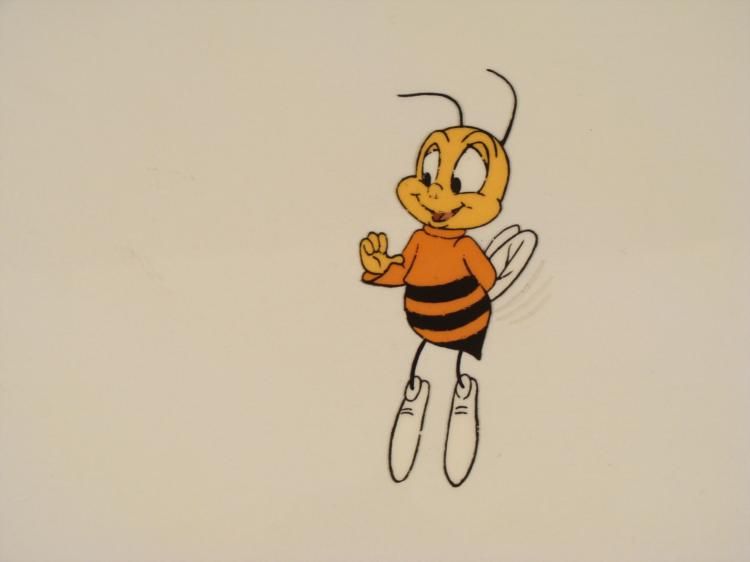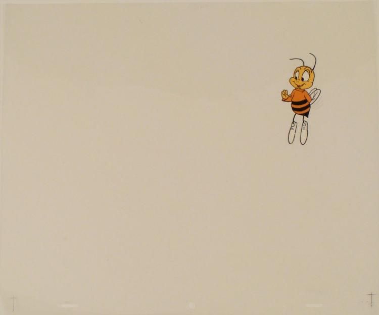 Here, it appears that Buzz is a cheerful bee. This is an original animation cel from the production of the Cheerios cereal commercial. * Medium: Hand painted acetate celCel size: 10 1/2 x 12 1/2 inchesDetails: Number and peg holes at the bottom edgeCondition: Very good; there is some slight paint fade *