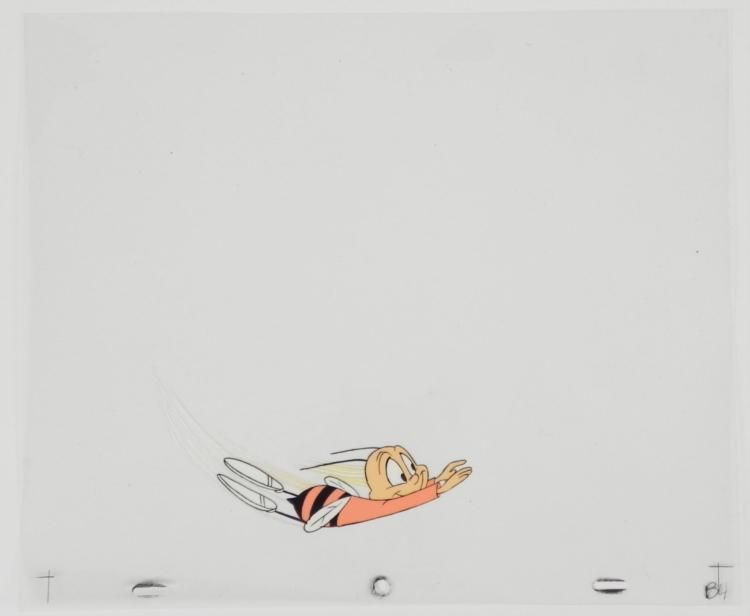 Normal 0 false false false MicrosoftInternetExplorer4 /* Style Definitions */ table.MsoNormalTable{mso-style-name:"Table Normal";mso-tstyle-rowband-size:0;mso-tstyle-colband-size:0;mso-style-noshow:yes;mso-style-parent:"";mso-padding-alt:0in 5.4pt 0in 5.4pt;mso-para-margin:0in;mso-para-margin-bottom:.0001pt;mso-pagination:widow-orphan;font-size:10.0pt;font-family:"Times New Roman";mso-ansi-language:#0400;mso-fareast-language:#0400;mso-bidi-language:#0400;} In this cel, Buzz appears to be soaring across the sky with super speed. This original animation cel is from the production of the Cheerios cereal commercial. * Medium: Hand painted acetate celDetails: Animation notations and peg holes * Size of cel: 10 1/2 x 12 1/2 inchesCondition: Very goodThis is an original hand-painted cel set-up used in the production of the "Cheerios commercial." Each one-of-a-kind set-up represents a slight change in position of the characters. When individually photographed and projected in rapid succession, the images appear to move. To created production cels, the original animator's drawing is transferred onto an acetate cel (by hand-inking and/or photo copying). The cel is then hand-painted on the reverse side. * *