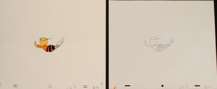 Here is Buzz the bee, introducing that new "Honey of an O" cereal. This is an original animation cel & drawing from the production of the Cheerios cereal commercial. * Medium: Hand painted acetate cel with drawing * Cel size: 10 1/2 x 12 1/2 inchesDrawing size: 10 1/2 x 12 1/2 inches * Details: Number and peg holes at the bottom edgeCondition: Very goodPencil color: non-photo blue and black *