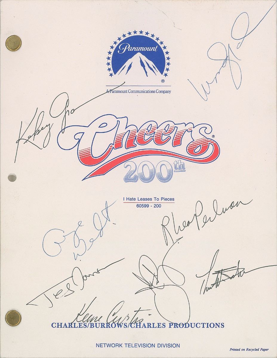 Brad-bound Paramount Pictures typescript for “I Hate Leases to Pieces,” the 200th episode of the NBC sitcom Cheers, 8.5 x 11, 49 pages, signed on the front cover in black ink by John Ratzenberger, Rhea Perlman, Ted Danson, Kelsey Grammer, Keene Curtis, and Thomas Babson, and in black ballpoint by George Wendt and Woody Harrelson. In fine condition. Accompanied by a full letter of authenticity from PSA/DNA.