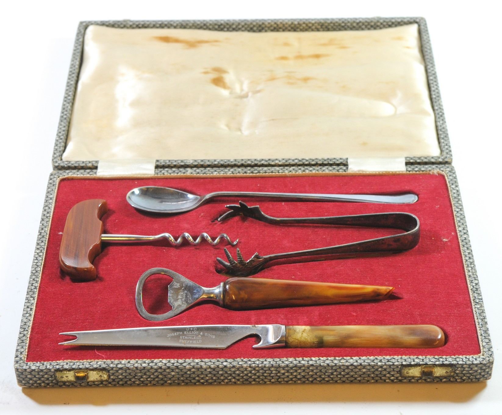 Cheese and wine serving set by Joseph Elliot & Sons, Sheffield, England, circa mid 20th century, stainless steel combining brown marble-like bakalite handles, in original case. Nice set in good condition!