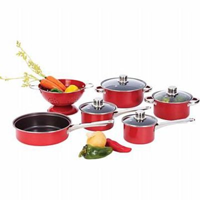 Chef's Secret 10pc Heavy-Gauge Even-Heating Steel Cookw **|**|** Set includes: 1qt saucepan with lid, 1.25qt saucepan with lid, 7-1⁄2" stockpot with lid, 9" stockpot with lid, 9-1/2" frypan, and 9" colander. Features non-stick interior, stain-resistant finish; vented, see-thru glass lids; and riveted stainless steel handles