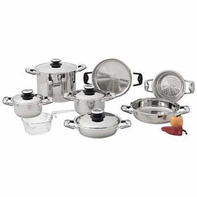 Chef's Secret 13pc Stainless Steel Cookware Set **|**|** This cookware set will have you cooking like a pro in no time. Each pan is made from beautifully polished, high-quality stainless steel together with high-quality stainless steel capped, riveted handles for durability and performance that will last a lifetime. Features thermo control top knobs and phenolic/stainless steel combination handles. Includes 12qt stockpot with cover, 2qt casserole with cover, 3qt casserole with cover, 9-1/2" frypan with cover, 11-1/2" frypan with capsule cover, universal step steamer, and 7" frying basket with removable handle. Limited lifetime warranty.