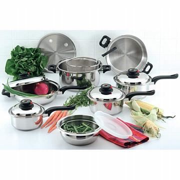 Chef's Secret 15pc 9-Element 304 Stainless Steel Cookwa **|**|** Features extra heavy-gauge stainless steel, a Steam Control valve to make healthy waterless cooking easy and 12-element construction that spreads heat quickly and evenly. Set includes: 1.7qt saucepan with cover, 2.5qt saucepan with cover, 3.2qt saucepan with cover, 7.5qt roaster with cover, skillet, dome cover, mixing bowl with cover that also works as a double boiler, steamer rack, and deep fry basket with handle. Limited lifetime warranty.