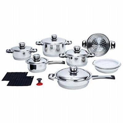 Chef's Secret 16pc 7-Ply Surgical Stainless Steel Cookw **|**|** Includes 1.6qt saucepan with cover, 2.2qt casserole with cover, 3qt casserole with cover, 6qt casserole with cover, 8" universal steamer, large frypan with cover, 8" mixing bowl with cover, 2 heat-resistant pan rests, and suction knob. Features mirror finish; thermo control knobs; and riveted, heat-resistant phenolic handles. Limited lifetime warranty
