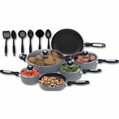Chef's Secret 16pc Hard Annodized Aluminum Cookware Set **|**|** Features see-thru vented glass covers; heavy-gauge aluminum for fast and easy heating; and riveted handles. Set includes: 1qt saucepan with cover, 1.5qt saucepan with cover, 2qt saucepan with cover, 5.5qt stockpot with cover, 8" frypan, 10-3/8" frypan, and as a bonus a 6pc nylon kitchen utensil set (pasta fork, slotted spoon, solid spoon, slotted spatula, slotted strainer, and ladle). Limited lifetime warranty on pans only (non-stick finish not included).