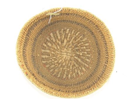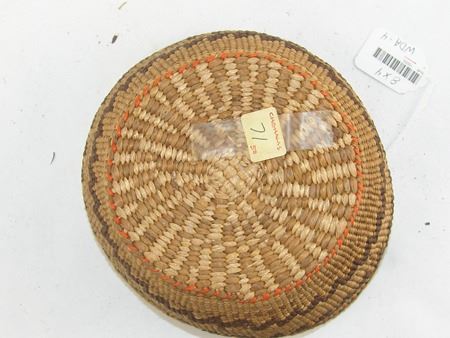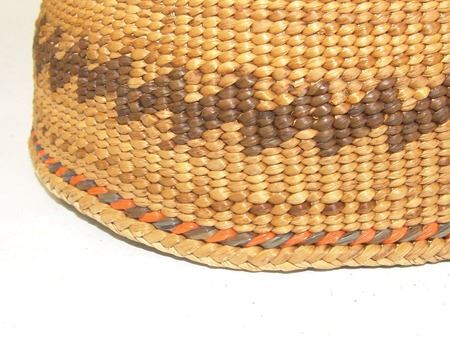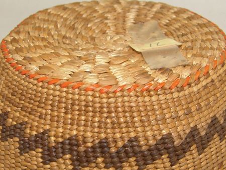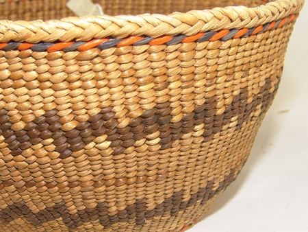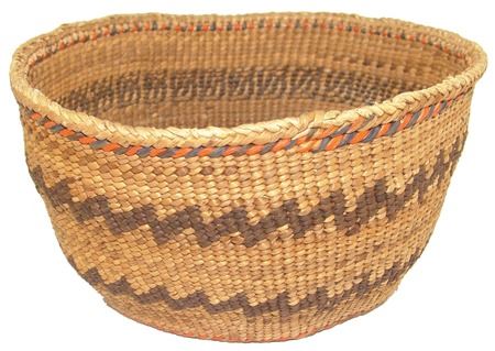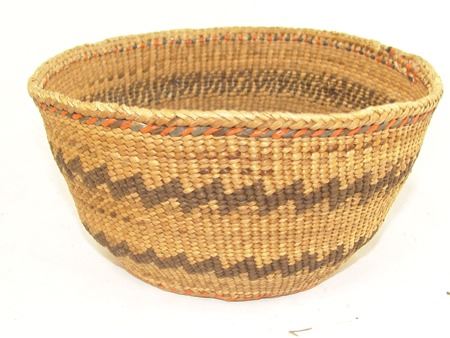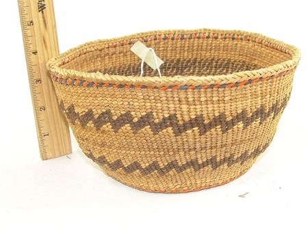 Ca. 1920s, Nice sturdy weave bowl with Modoc style design and orange ticking near rim and base. Very good condition. 4" x 8"