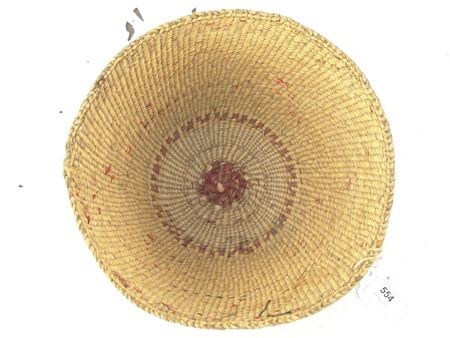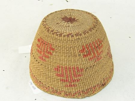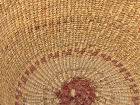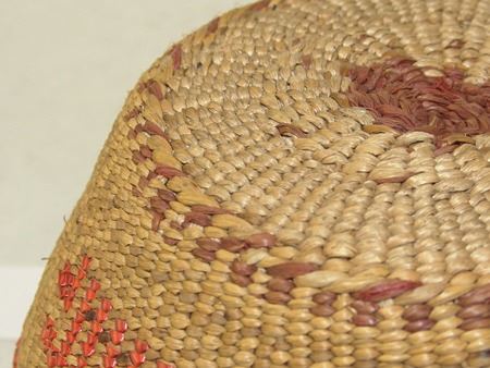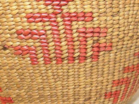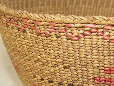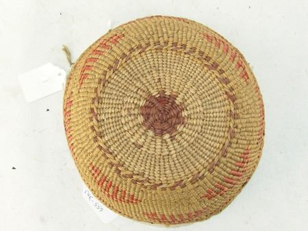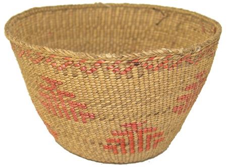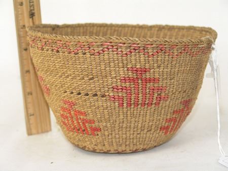 Mid 1900s, Finer weave flared bowl with traditional exterior geometric designs done in pink/orange. Very good condition. 5" x 7-1/2"