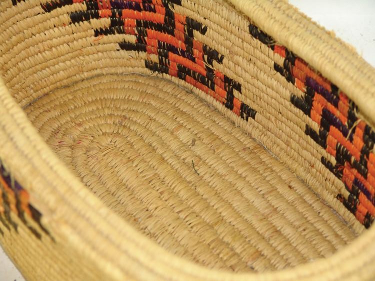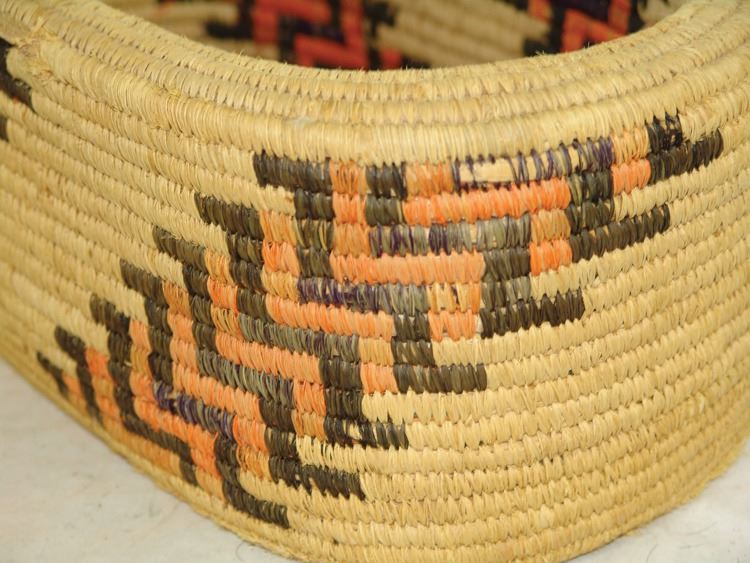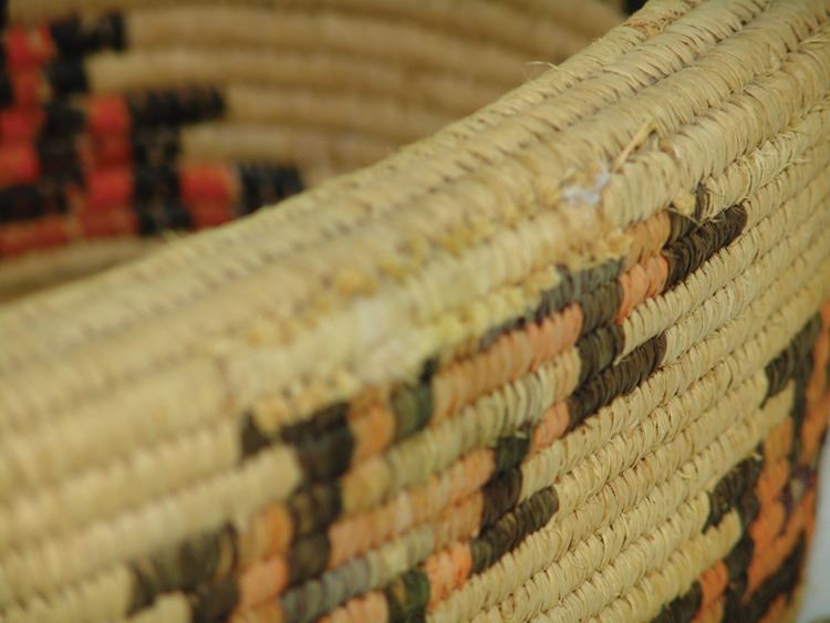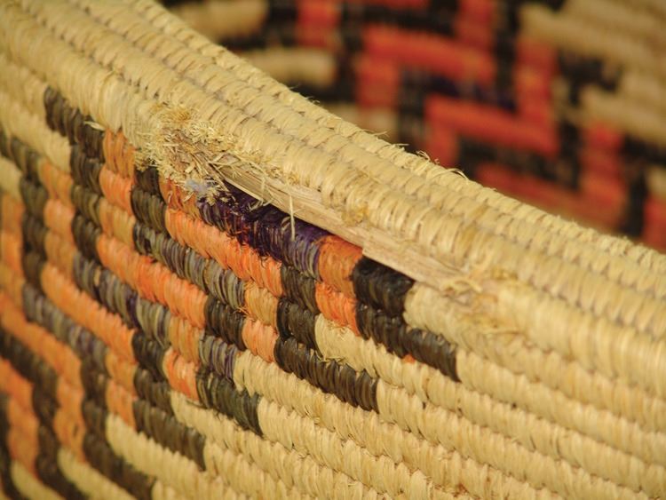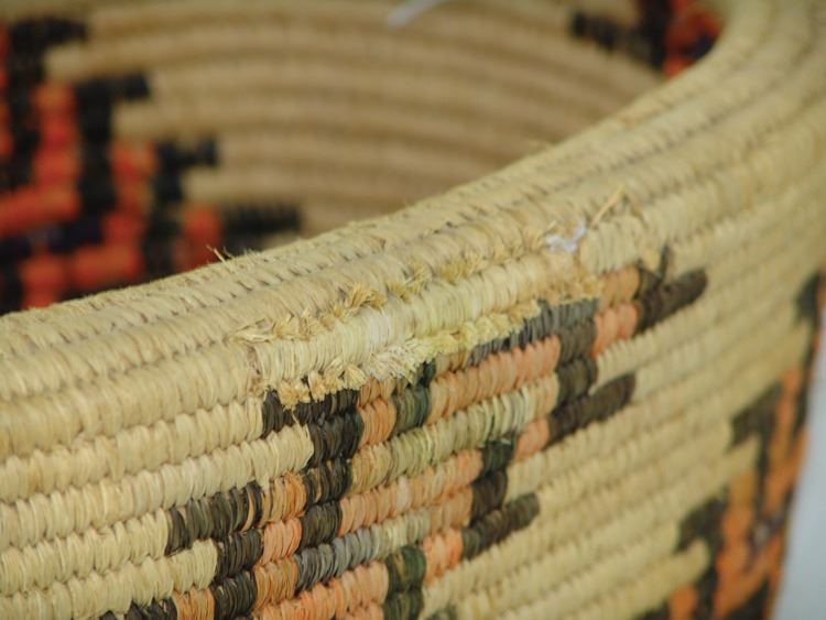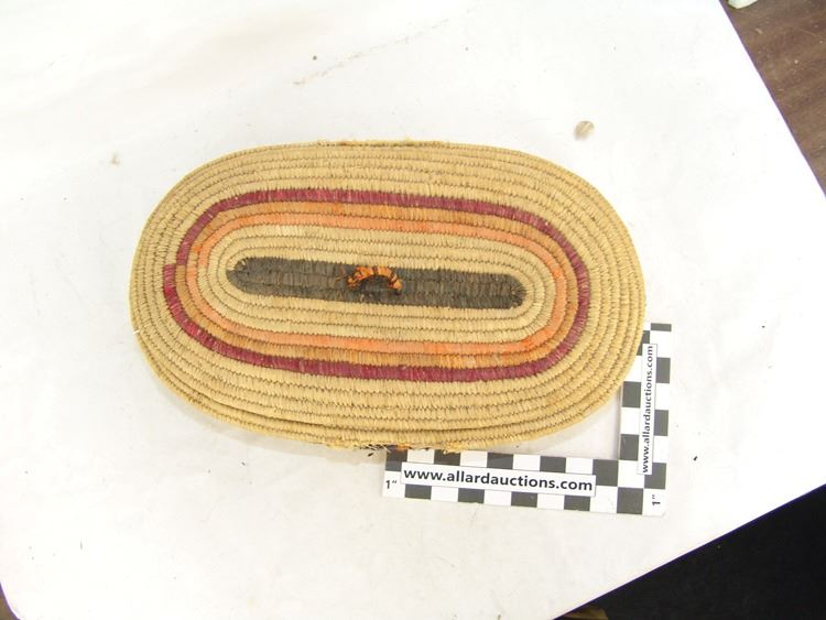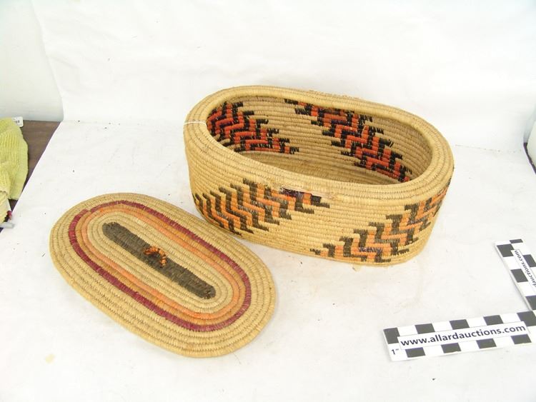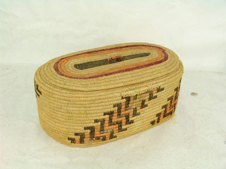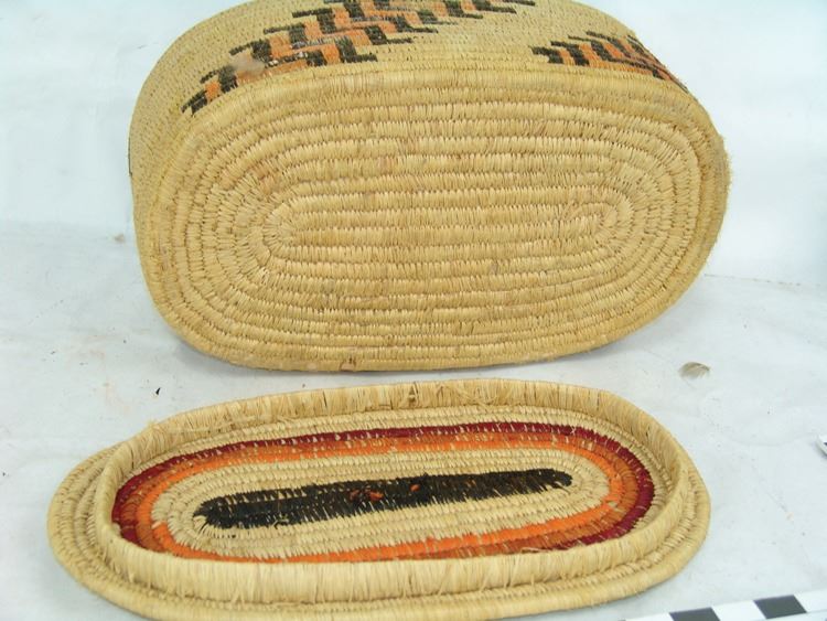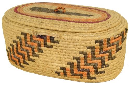 Unique rather large oval shape lidded storage basket made from natural and dyed raffia. Very good condition. Original handles on sides have been removed. Minor stitch loss.,Mid 1900s,17" x 10" x 7"