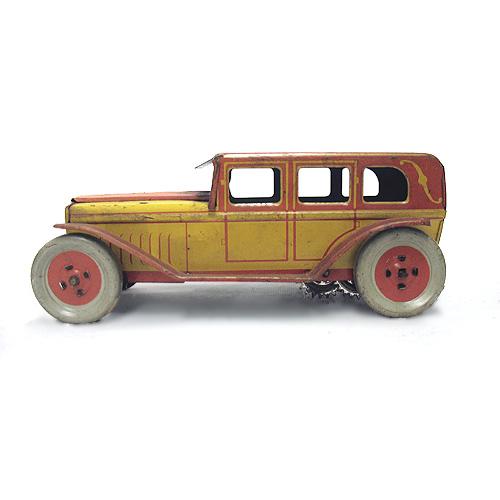 Chein tin wind-up car; works; 1940's; 3" high x 7" x 3 1/4" (very minor paint loss)