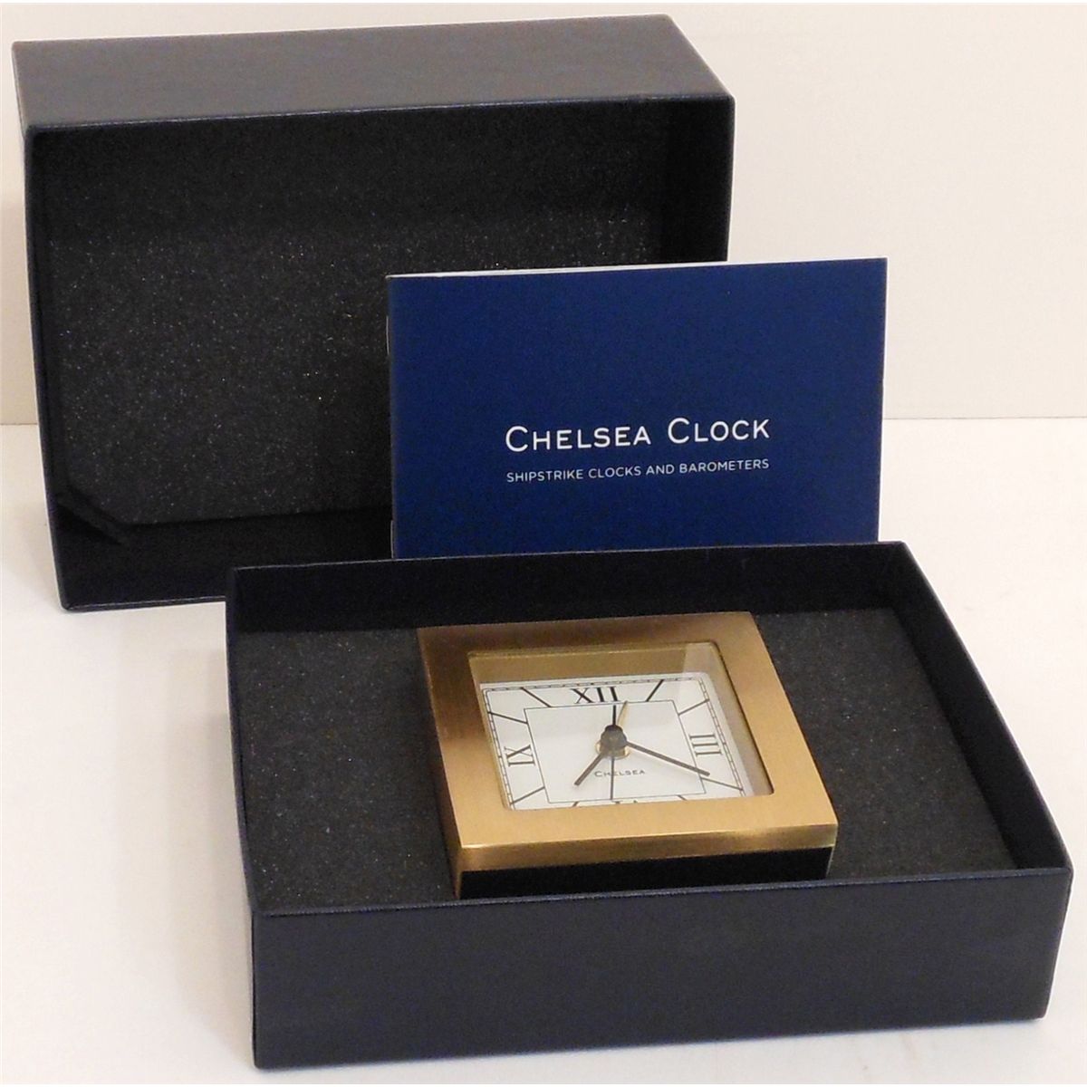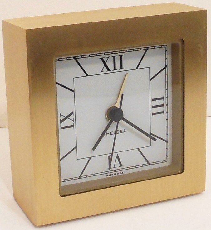 3 1/2" X 3 1/2". Chelsea Battery Powered Brass Alarm Clock with Box. Needs Battery. Great Condition. Looks to have never been used!