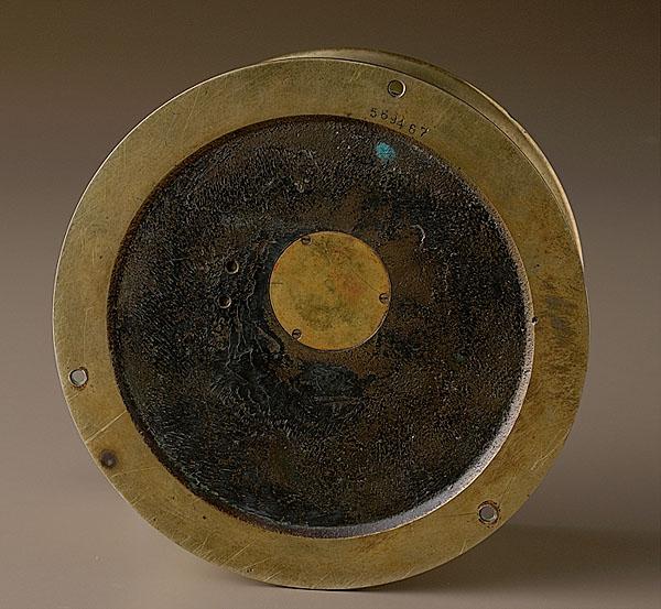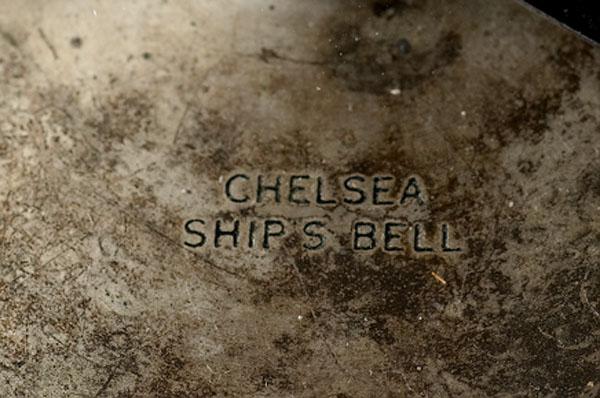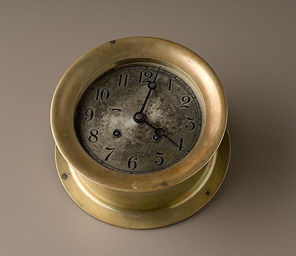 ca 1950-54. A Chelsea Ships Bell clock in a polished brass case, with screw-on bezel, silvered dial, black painted etched numerals, Slow-Fast dial between the 9 and 10. Eight-day springwound movement with ships bell strike on the half hours. Serial number on base and movement, 569467. Dial signed, Chelsea/ Ships Bell. 7.25" diameter across the bezel; 7.5" across the base.