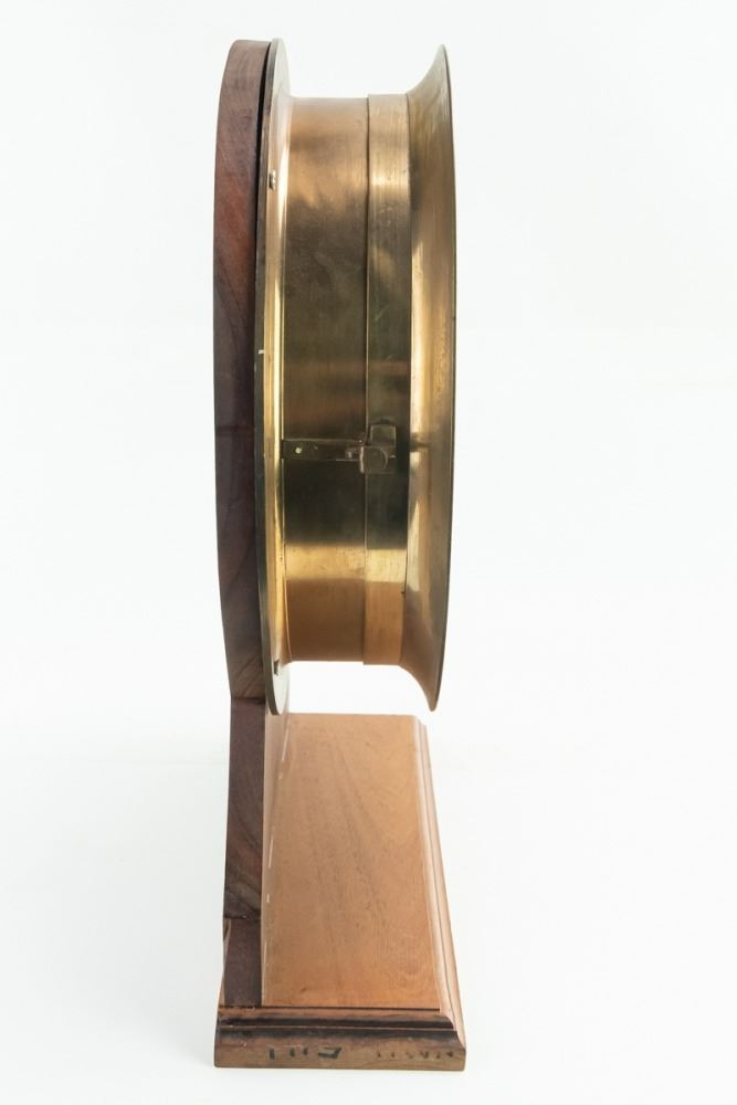 Manufactured by the Chelsea Clock Co of Boston, this brass wall clock is mounted on a custom wooden base. The clock does not have its key, but it does wind and is running. It has not been tested for an extended period of time. The clock measures 14 3/4"Diameter x 3 5/8"W. The dial measures approximately 11 7/16", with the base it is 19 1/2"H. The key is not present. Following is additional information which was found behind the back of the clock: Chelsea Clock Co./American Steam Gauge Co., Boston, Mass., wall clock, polished brass hinged case , blued steel hands with a compensating minute hand, 12 in. painted metal dial with roman numerals, 8 day, time only, spring driven movement. Serial #135650 stamped on the machine engraved plate screwed to the interior of the hinged case. This number in the factory sales ledger indicates a Model "B" (Recording Steam Gauge) movement sold to the "American Steam Gauge Co." on "August 4, 1920." The zinc dial appears to be a replacement with additional mounting holes that do not align with the case pillars and the Model E serial #132668 movement is held in place with newer steel clips. The factory number on this movement indicates it was originally housed in a clock sold to Cincinnati Jeweler, "Loring Andrews & Co." and shipped on "Nov. 12, 1919." The Regulator Pointer is missing.