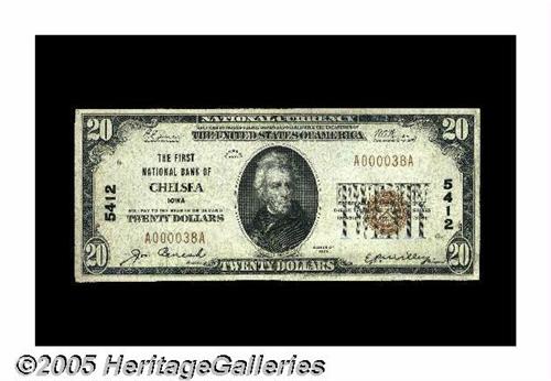 <B>Chelsea, IA</B></I> - $20 1929 Ty. 1 <B>The First NB</B></I> Ch. # 5412<BR>A fresh note from the only bank to issue in this Tama County community. <B>Very Fine,</B></I> with claims to a higher grade but for a light cast of soiling. This institution printed only 121 sheets of the $20 denomination before succumbing to the Depression in 1933, leaving the community without benefit of a federally chartered thrift institution.