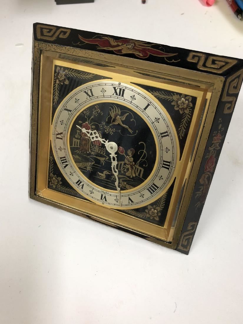 Chelsea Picture Frame Clock with the Asian oriental decorative enamel painted face. Unusual Chelsea Mass made clock.