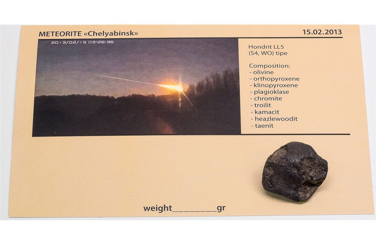 This is an excellent specimen displaying unsusually complete fusion crust from the largest meteor impact to hit the earth in 100 years. The meteorite hit the earth on the 2nd of February 2013 at 9:26am. On impact with earths atmosphere, the meteorite weighed 10,000 tons and was 17 meters in diameter. It exploded at an of elevation of 23 kilometers with a power of a half a mega ton nuclear explosion. When it detonated, it created a shock wave for 100 miles that damaged or destroyed windows in two cities, sending 1,500 people to the hostpital, collapsing the roof of a zinc factory, and causing a billion rubles of damage. A total of about 1000 pounds of the meteorite was recovered after the fall of which less than 10 percent has made it into the US. Complete specimens represent less than a third of the find. This is the most documented meteorite fall in history. - HKA#65136