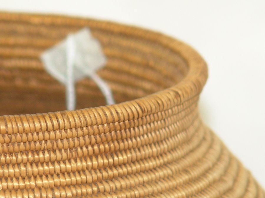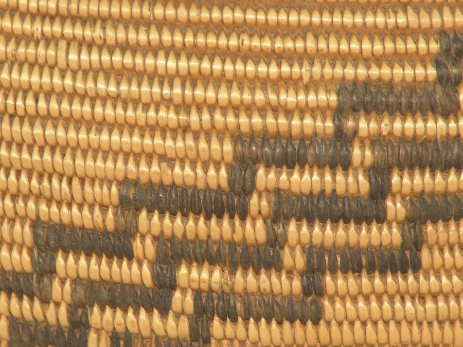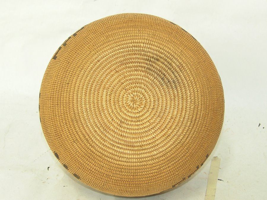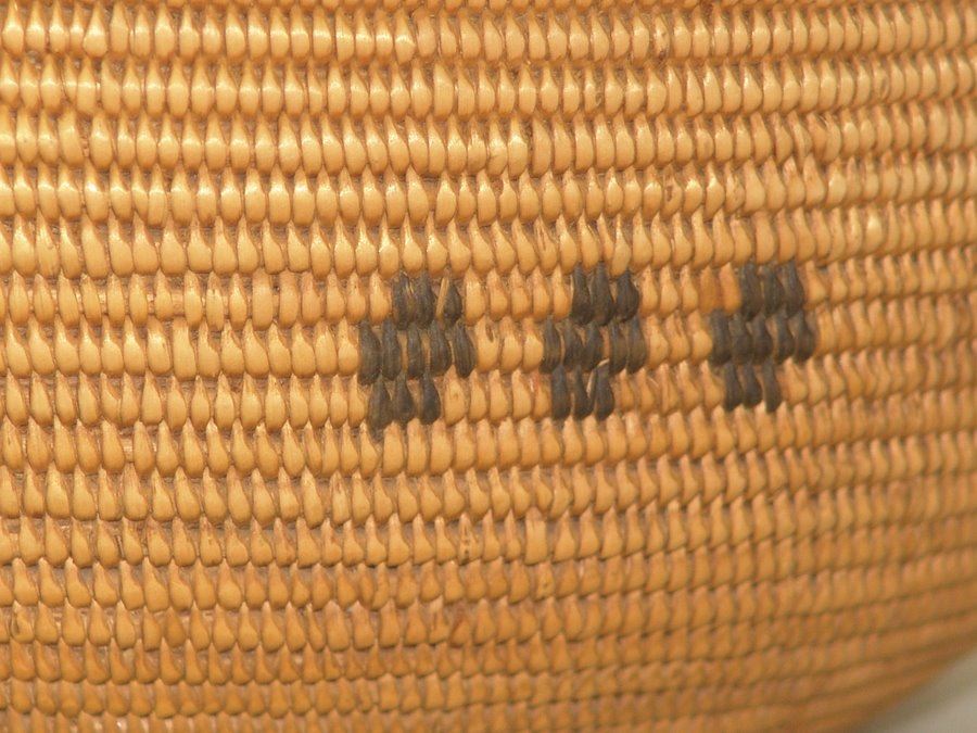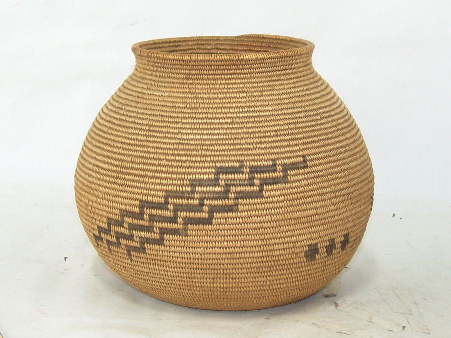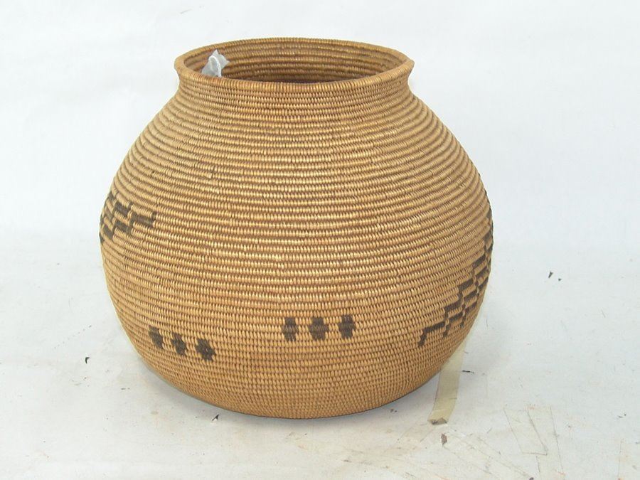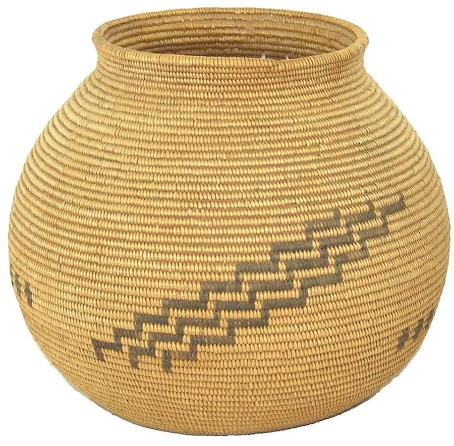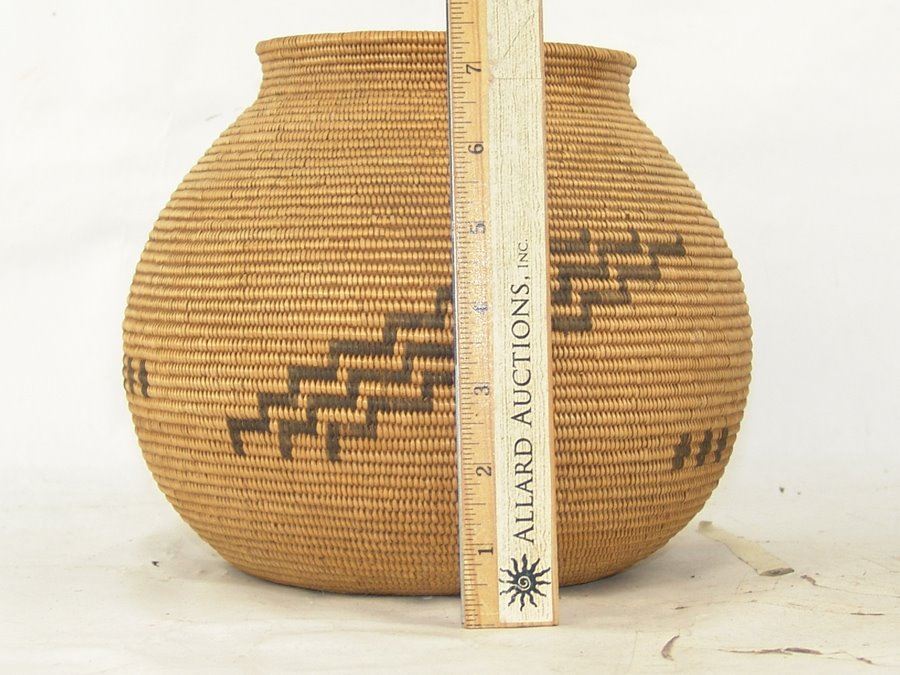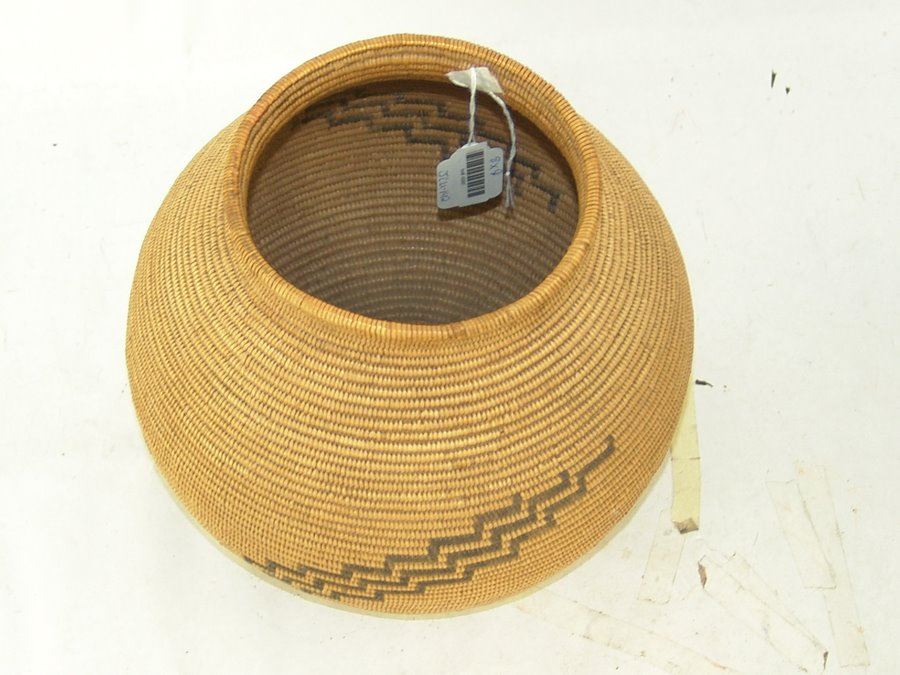 Outstanding, fine weave rounded basketry olla with simple radiating step design plus several small crosses. An exceptional example of Chemehuevi work. Very good condition.,,8" x 9"