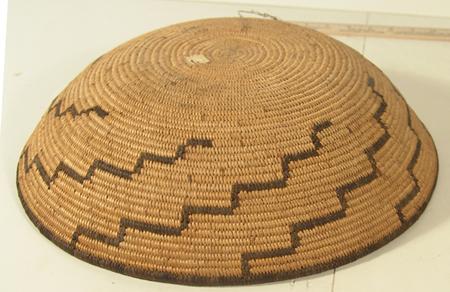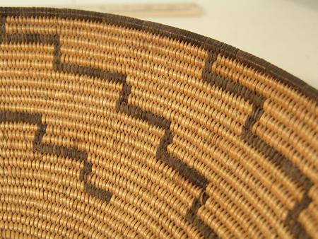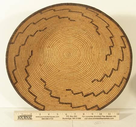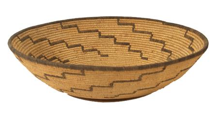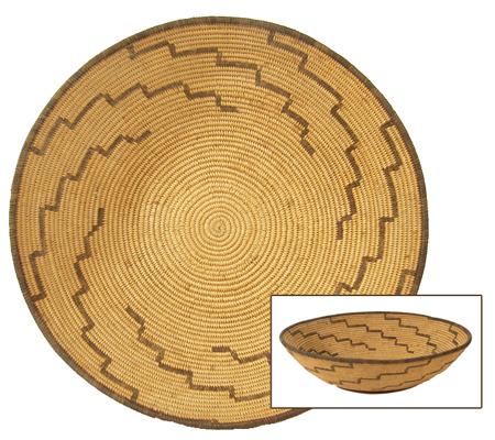 Beautiful fine weave basketry bowl with radiating stepped design. Condition: very good, tight, good color. 3-1/2" x 13-1/2"