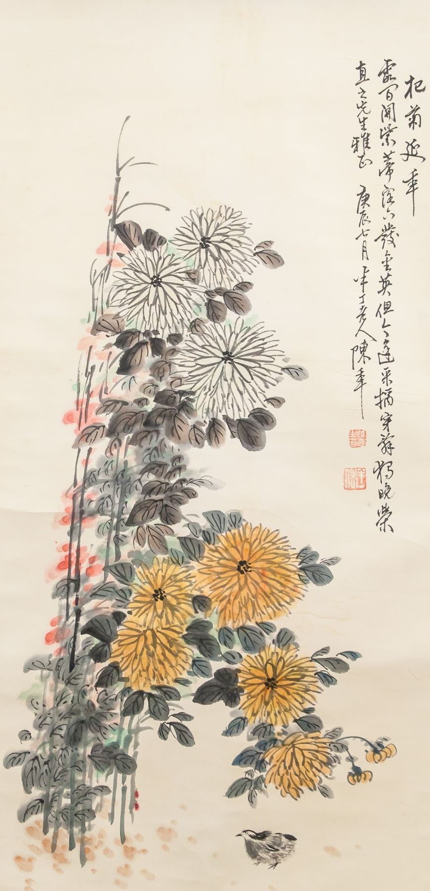 Chinese ink and watercolor on hanging scroll. Featuring orange and white chrysanthemum flowers. Signed "Banding" in Chinese characters and inscribed with two artist seals. Attributed to Chen Banding (1876-1966, Chinese). 98 x 49 cm