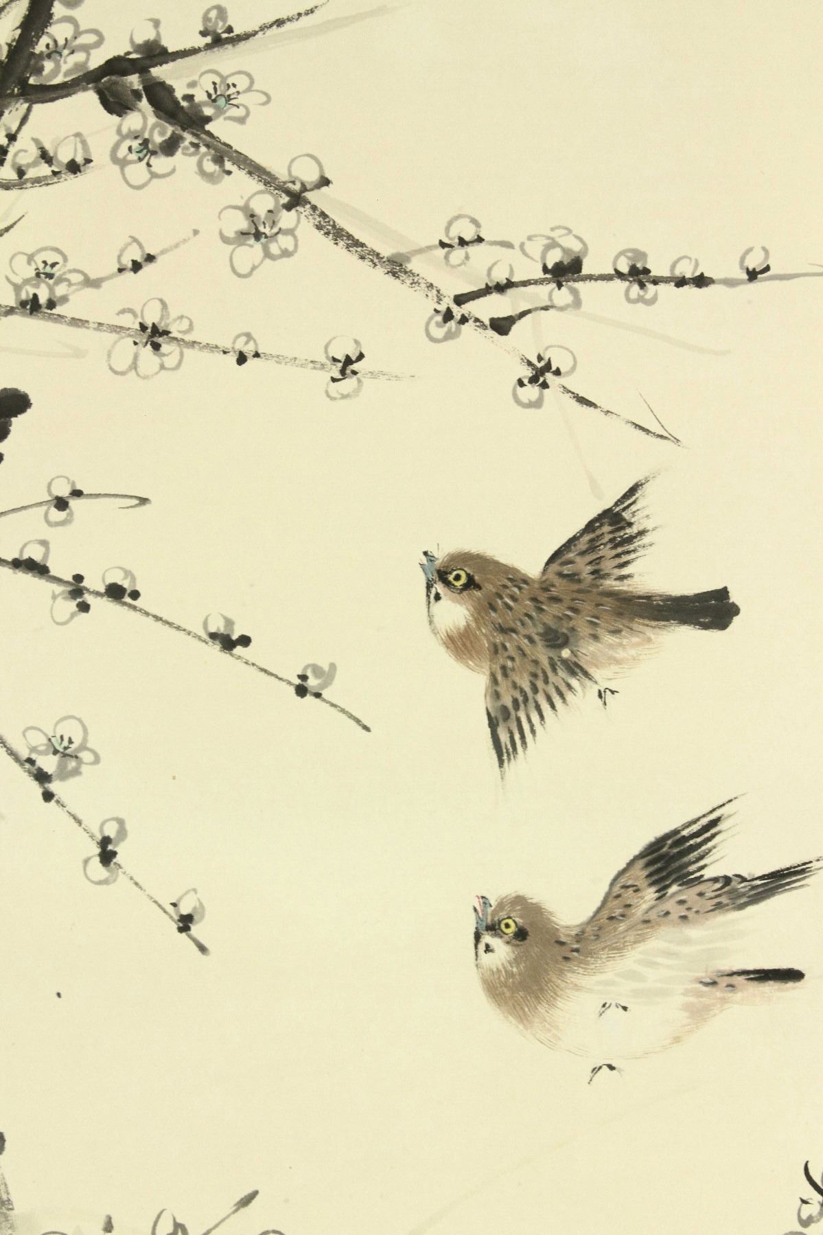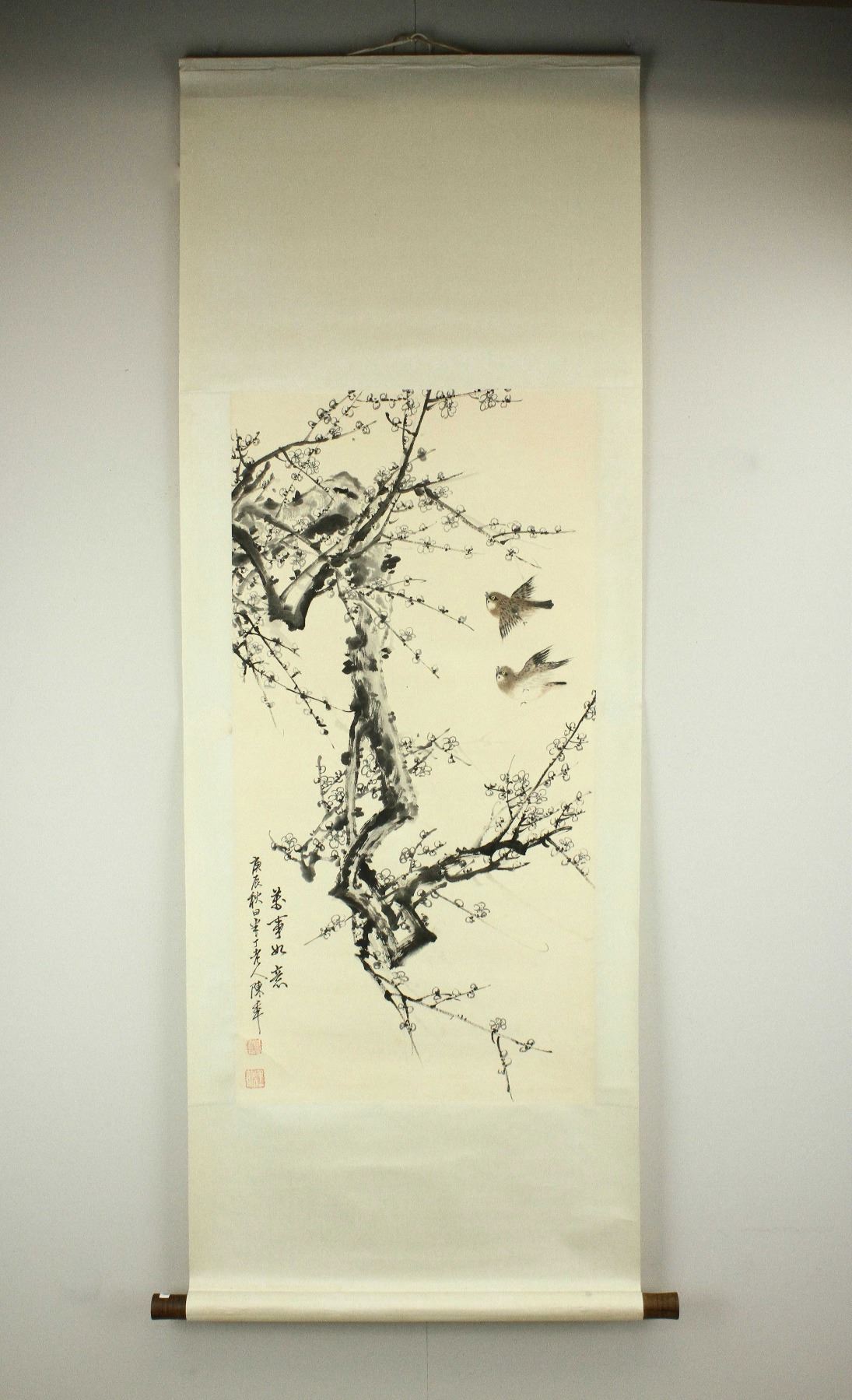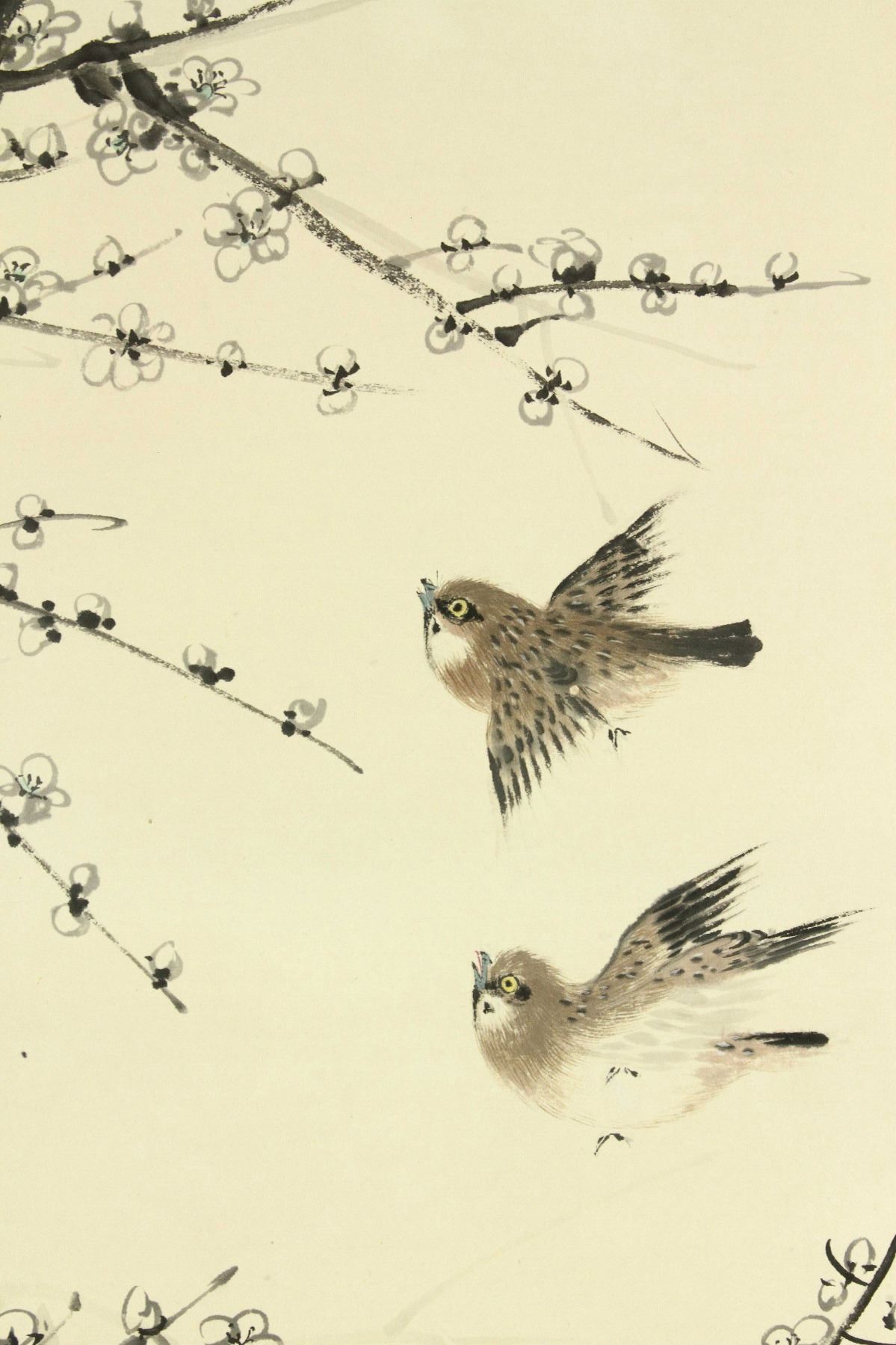 Birds and plum blossom tree; Chinese ink and watercolour on paper; hanging scroll; signed and inscribed with two artist seals; 92 cm x 44 cm