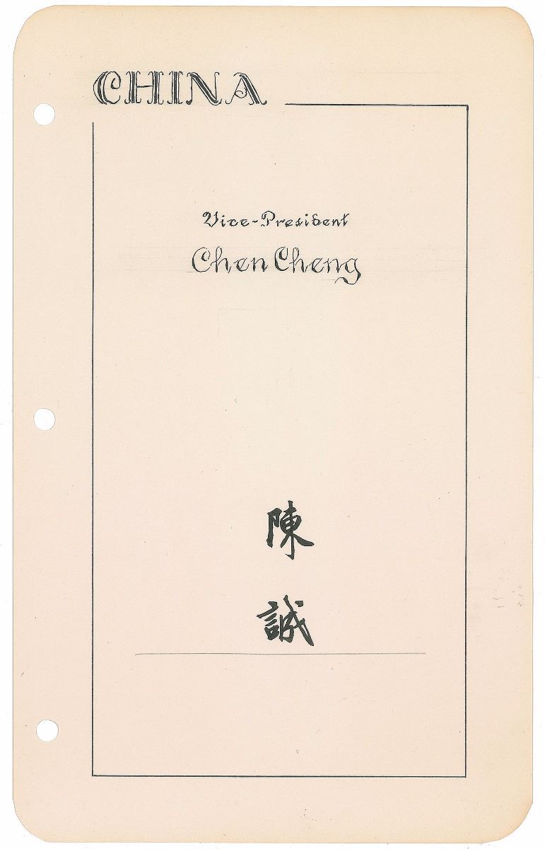 Chinese political and military leader (1897–1965) who was one of the main National Revolutionary Army commanders during the Second Sino-Japanese War and the Chinese Civil War. Bold ink signature in Chinese of Chen Cheng on an off-white 6 x 9.5 sheet hand-embellished with a calligraphic title. In fine condition.