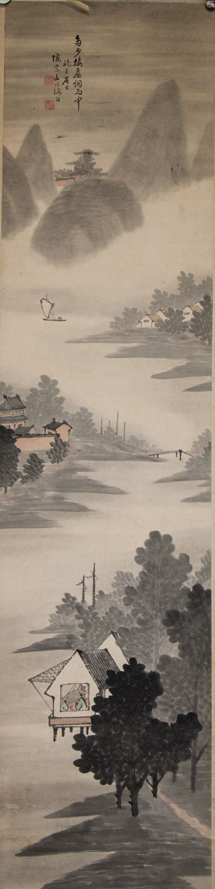 Ink and watercolor on paper. Featuring mountainous landscape and river scene. Signed Chen Jingwen, inscribed with 2 artist seals. 16th-18th century. 135 x 34 cm. PROVENANCE: Forest Hill, Toronto estate