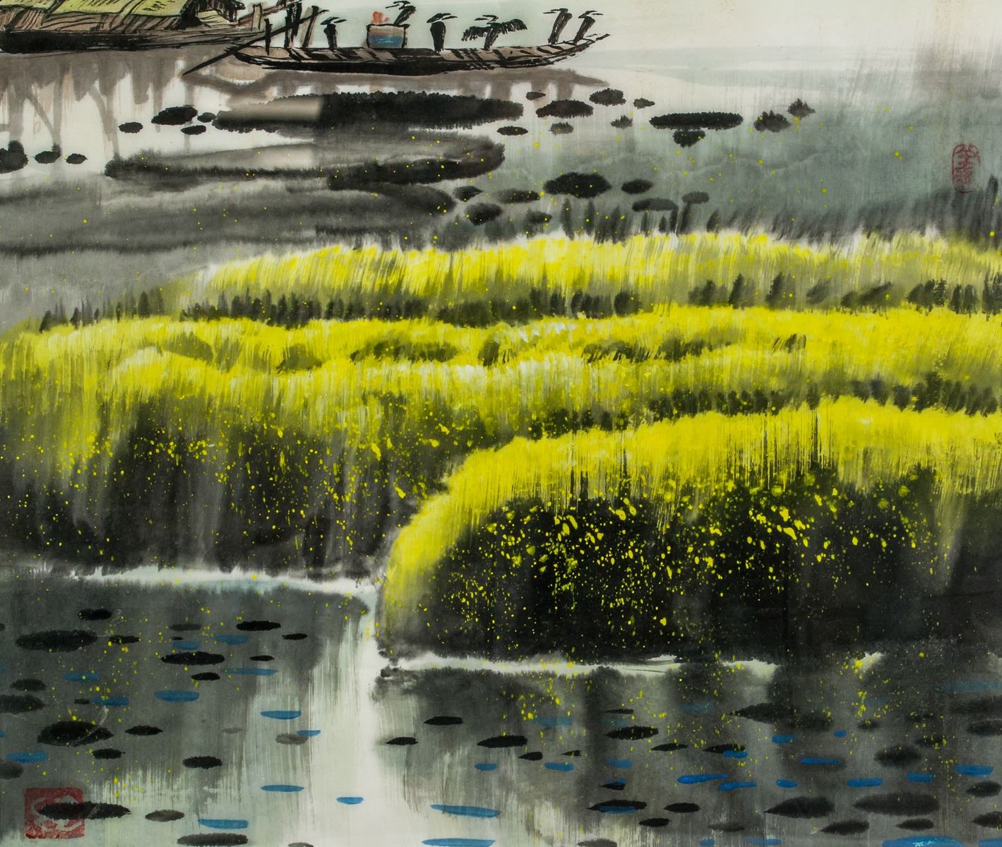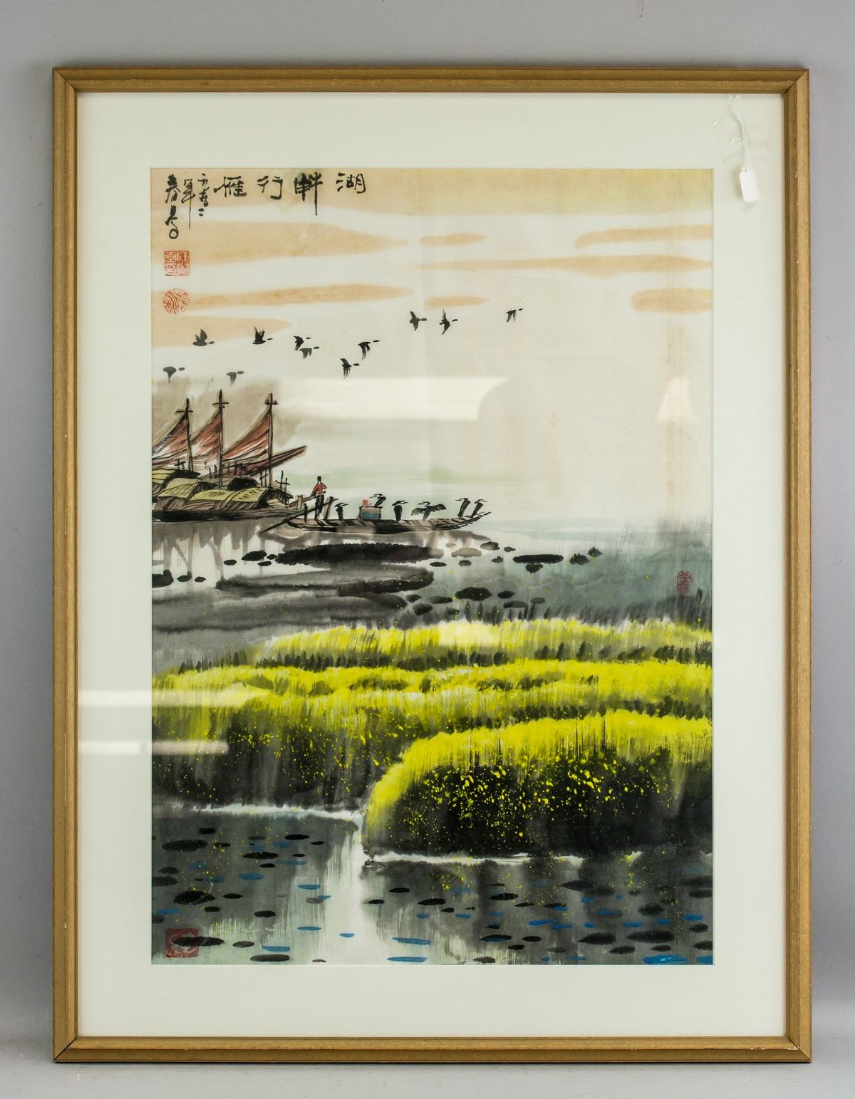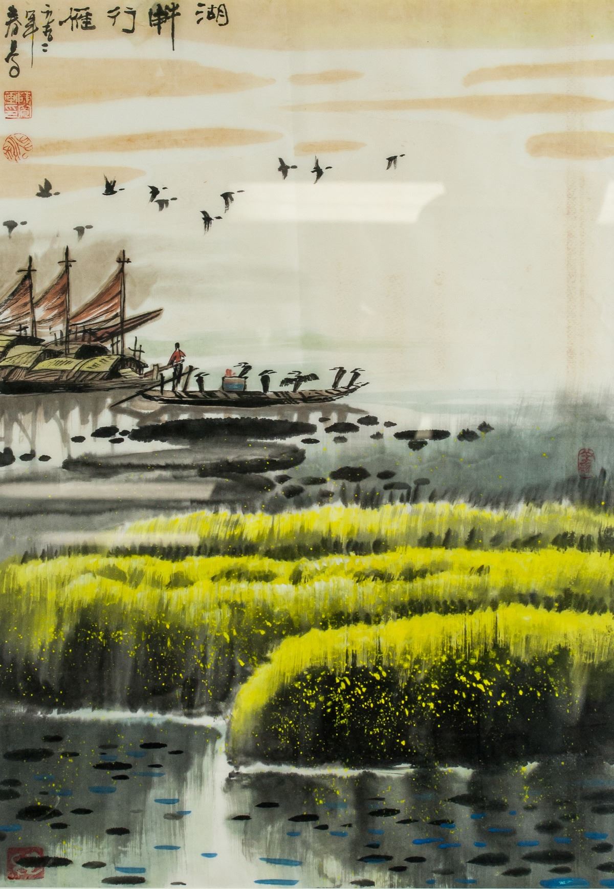 Watercolor on paper, framed. Featuring a landscape scene. Signed Chen Kuan, Chinese contemporary artist, inscribed with 3 artist seals. 63.5 x 45.5 cm (25 x 17.9 inches). Frame size: 81 x 61 cm (31.9 x 24.0 inches)