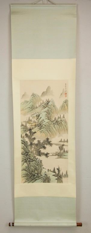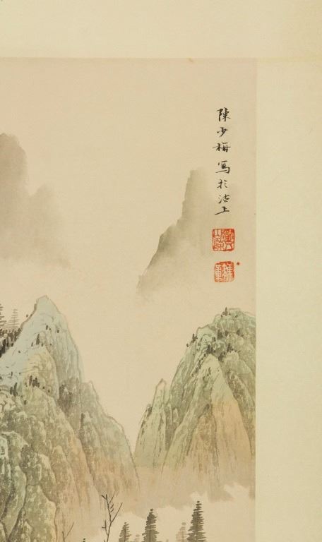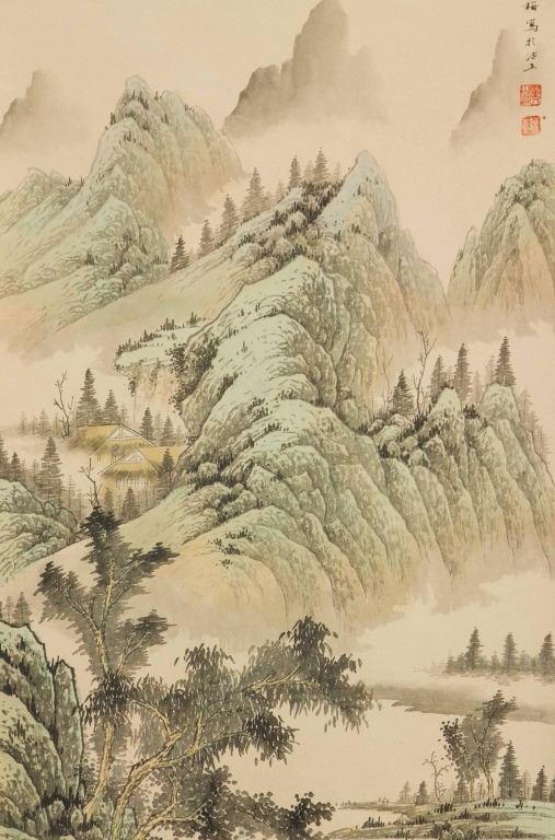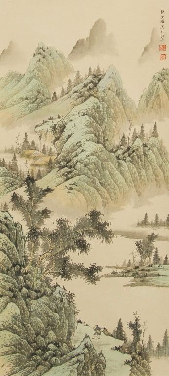 Mountainous landscape with village; Chinese ink and watercolour on paper; hanging scroll; signed Chen Shaomei (1909-1954); inscribed with 2 artist seal; 92 cm x 42.5 cm