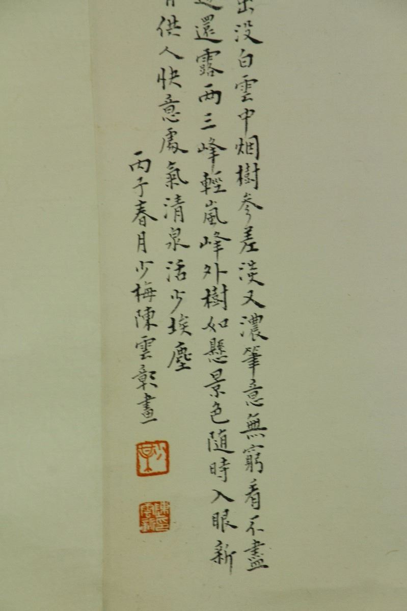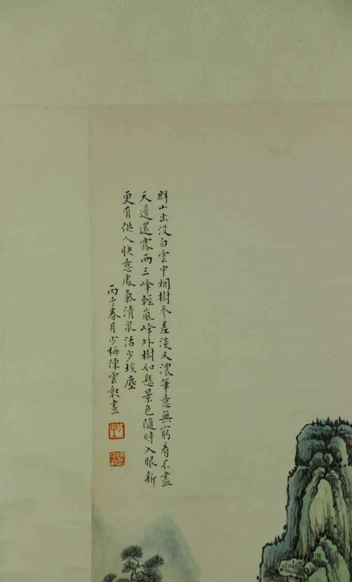 Village amongst mountains; Chinese ink and watercolour on paper; hanging scroll; signed Chen Shaomei and inscribed with two artist seals; 206 cm × 63 cm