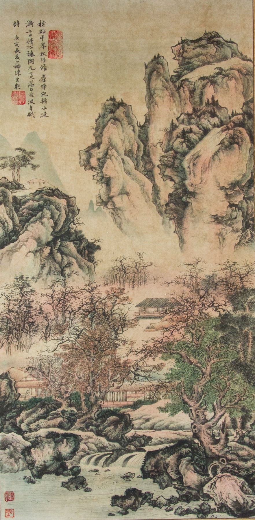 Mountainous landscape and village; Chinese ink and watercolour on paper; hanging scroll; signed Chen Shaomei (1909-1954); inscribed with 4 artist seals; 88 cm x 44 cm
