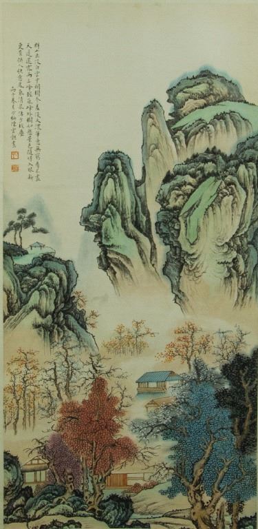 Village amongst mountains; Chinese ink and watercolour on paper; hanging scroll; signed Chen Shaomei and inscribed with two artist seals; 206 cm × 63 cm