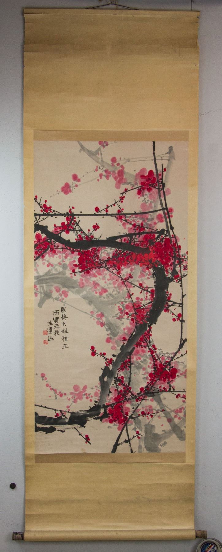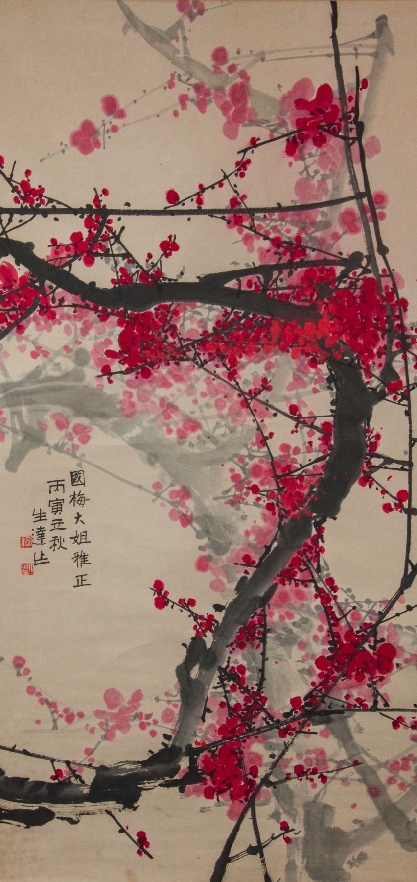 Painting of red plum flower tree; Chinese ink and watercolour on paper; hanging scroll; signed Cheng Shengda (b.1938); inscribed with 2 artist seals; 103 cm x 50.5 cm