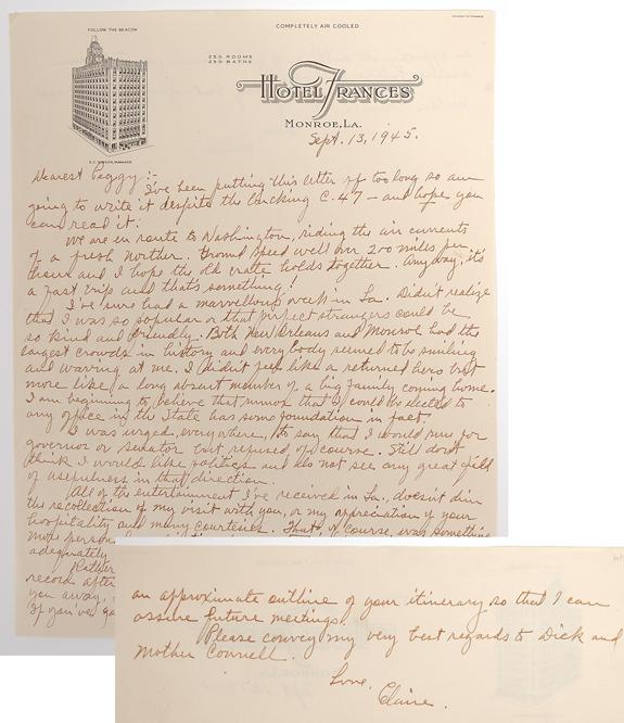 Chennault, Claire L (1890-1958) Armerican Army aviator who established the volunteer-staffed Flying Tigers to fight the Japanese invasion of China. He has been unofficially credited with over 40 "kills." Autograph letter signed ("Claire") on "Hotel Frances, Monroe, LA" letterhead, 1 page, 11x8½", Monroe, Louisiana, Sept. 13, 1945. Penned aboard an airplane to "Peggy," a lady friend. In part: "…We are en route to Washington, riding the air currents….Ground speed well over 200 miles per hour and I hope the old crate holds together. I've sure had a marvellous week in La. Didn't realize I was so popular or that perfect strangers could be so kind and Friendly. Both New Orlelans and Monroe had the largest crowds in history and everybody seemed to be waving at me. I didn't feel like a returned hero but more like a long absent member of a big family coming home….I was urged…to say that I would run for governor or senator but refused, of course. Still don't think I would like politics…." Fine condition.