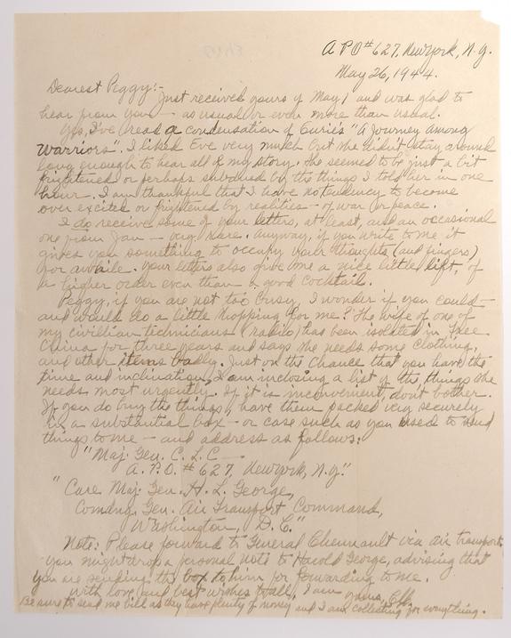 Chennault, Claire L. Autograph letter signed "CLC' at the end and "Maj. Gen. C.L.C." and "General Chennault" in the text, 1 page, 10 x 8" (China), May 26, 1944. To "Peggy," a lady friend, mentioning that he had read "a condensation of [Eve] Curie's 'A Journey Among Warriors'. I liked Eve…but she didn't stay around long enough to hear all of my story. She seemed to be just a bit frightened….I am thankful that I have no tendency to become over excited or frighted by realities--of war or peace…." He also asks Peggy to do some shopping for "the wife of one of my civillian [sic] technicians (radio) [who] has been isolated in Free China for three years…." and gives instructions on where to send the package. Fine condition.