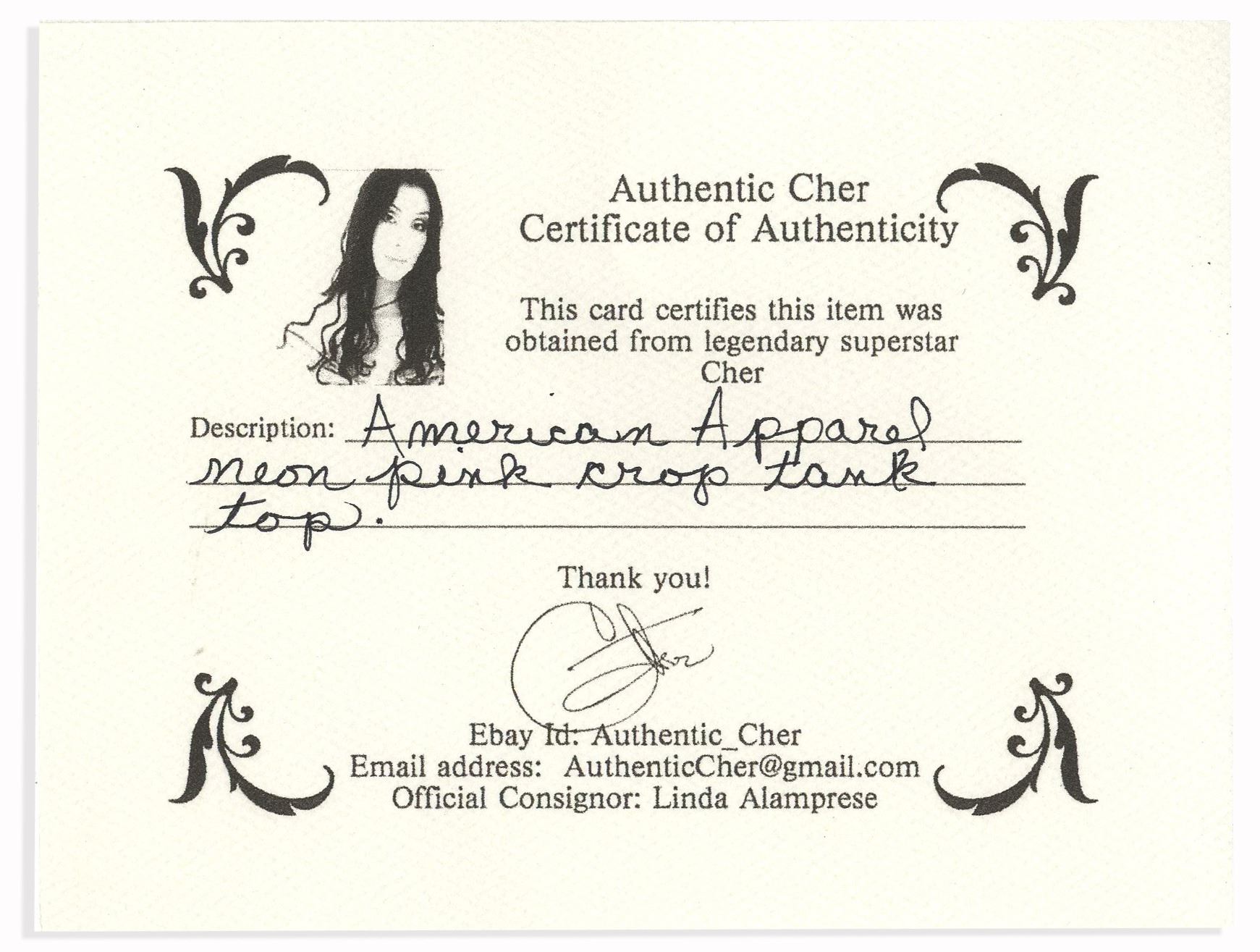 Cher's personally owned top. Cropped tank top in hot pink by Neon Fifty Fifty American Apparel is one size fits most. Near fine. With a COA from Linda Alamprese, Cher's memorabilia consignor.