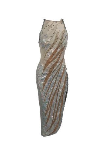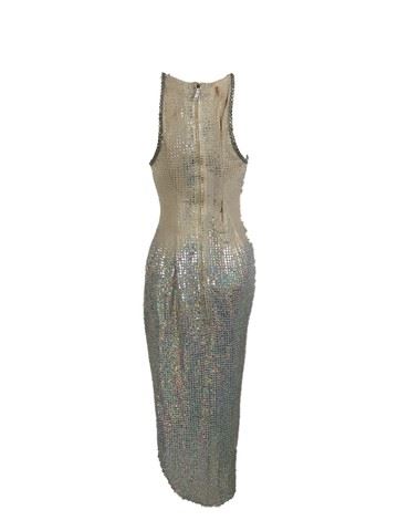 Cher's personally owned and worn silver sequin, ankle length dress with high side slit and zip back. Resembles her iconic sheer dress which was also custom designed by Bob Mackie and Elizabeth Courtney (a Hollywood costume designer).