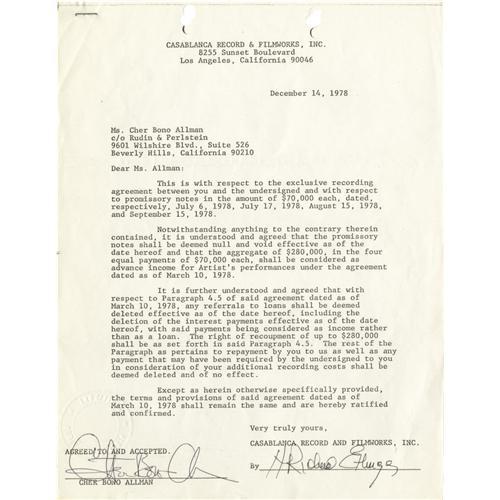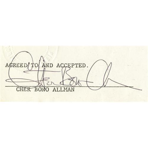 <B>Cher Signed Casablanca Records Contract.</B></I> A single-page payment agreement between Cher and Casablanca Record and Filmworks, dated December 14, 1978, and signed "Cher Bono Allman" in black ink. IN Very Fine to Excellent condition with a staple and punch holes to the top edge.<I>Accompanied by LOA from PSA/DNA.</B></I><BR><BR><b>Shipping:</b> Flat Material, Small (<a target="_blank" href="http://www.heritageauctions.com/common/shipping.php">view shipping information</a>)