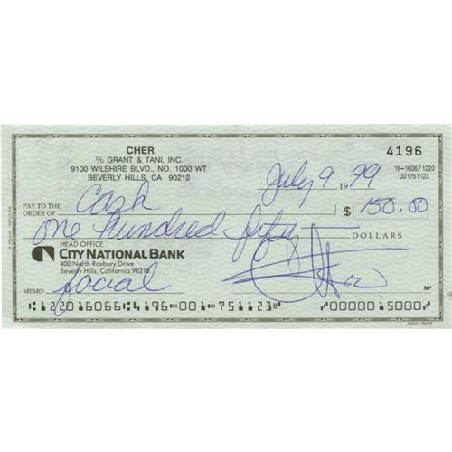 <B>Cher Signed Check.</B></I> A personal check written for $150 dollars in cash, dated July 9, 1999 (with "facial" written on the memo line), and signed by Cher in blue ink. In Very Fine to Excellent condition with the usual bank cancellation stamps on the reverse and a couple of minor fold creases.<I>Accompanied by LOA from PSA/DNA.</B></I><BR><BR><b>Shipping:</b> Flat Material, Small (<a target="_blank" href="http://www.heritageauctions.com/common/shipping.php">view shipping information</a>)