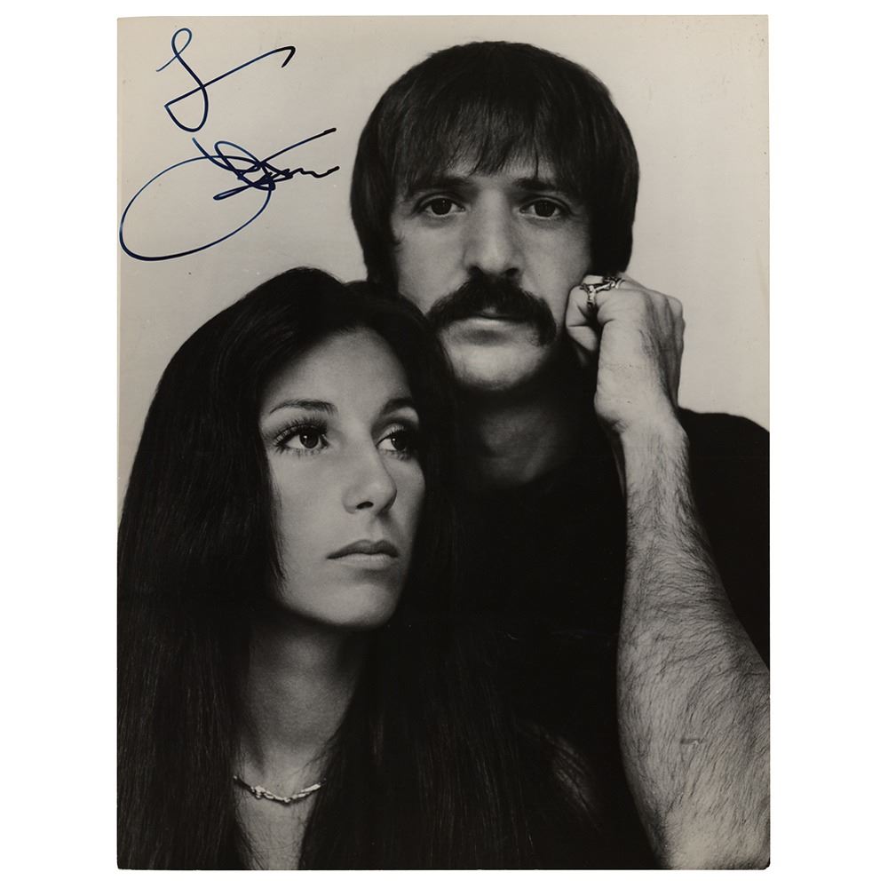 Semi-glossy 7.25 x 9.5 lightweight photo of Sonny and Cher from the 1970s, signed in fountain pen, "Love, Cher." In fine condition, with trimmed edges.