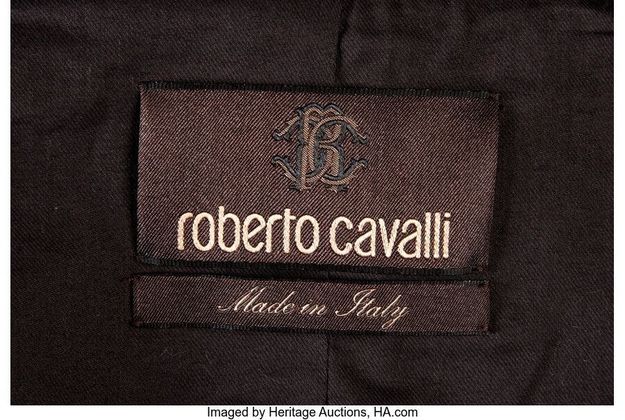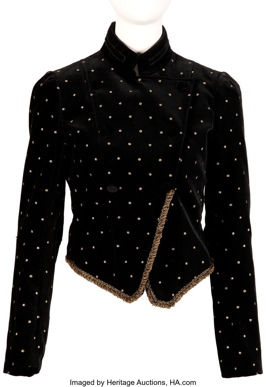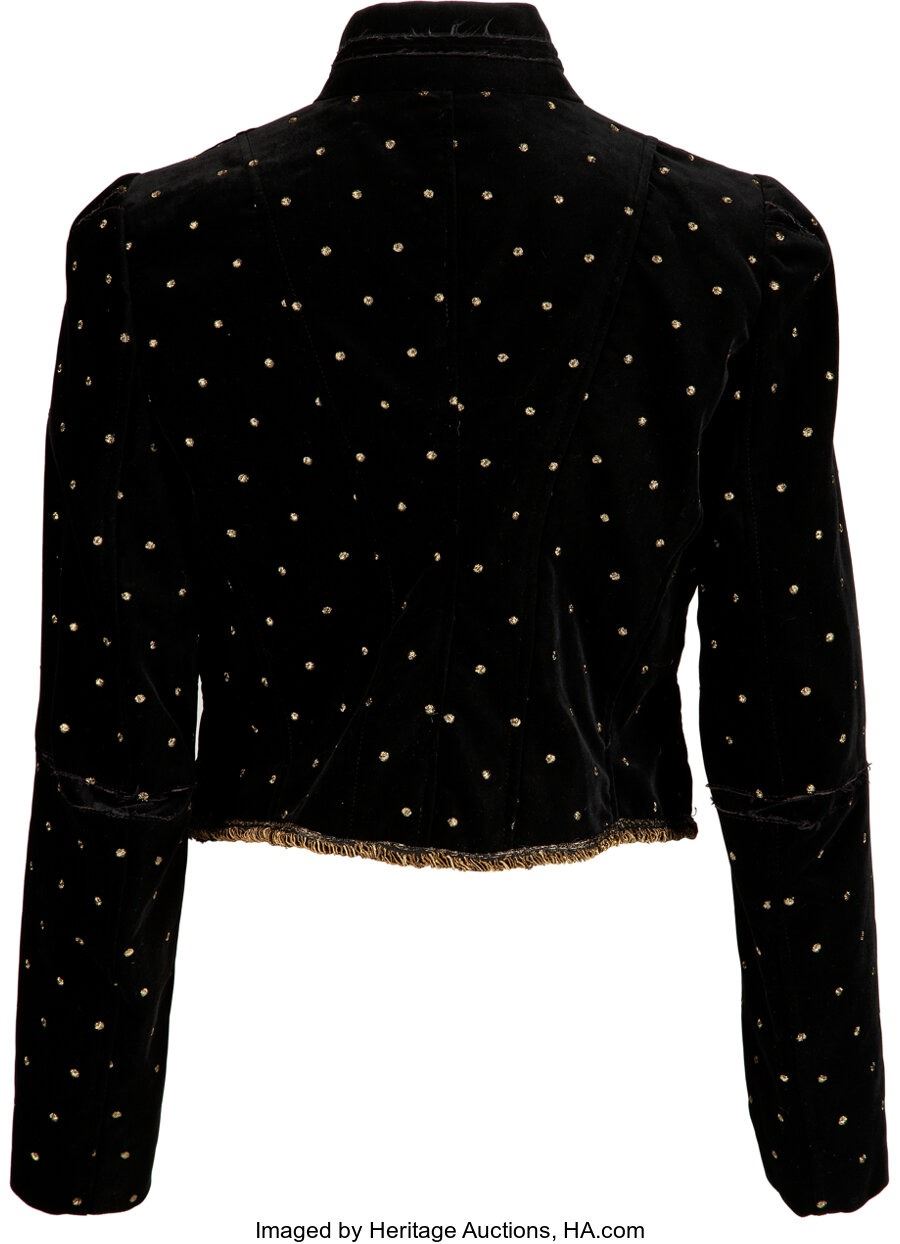 Cher's Personally Owned and Worn Roberto Cavalli Black Velvet Jacket.A black velvet Roberto Cavalli jacket worn by the screen and stage legend. The military-style jacket has gold embroidered polka dots and braided trim. Italian size 44, measuring 15" across the chest. In Near Fine condition. With a COA from Linda Alamprese, Cher's memorabilia consignor. COA from Heritage Auctions.
