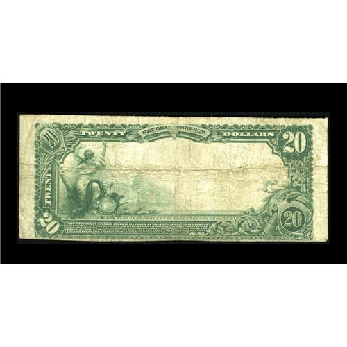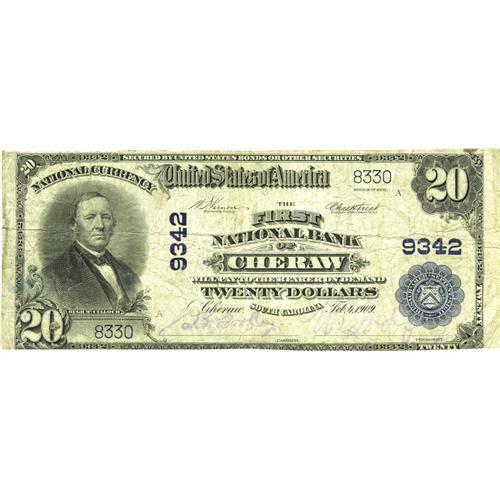 <B>Cheraw, SC</B></I> - $20 1902 Plain Back Fr. 652 <B>The First NB</B></I> Ch. # 9342<BR>Large notes only from this very scarce bank, which was the only issuer in upstate Chesterfield County. The census from here stands at just six pieces, with just three offerings of any kind at public sale during the past six decades. Pleasing <B>Fine+,</B></I> with purple signatures.
