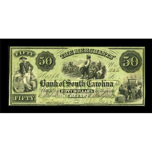 <B>Cheraw, SC- Merchants' Bank of South Carolina</B></I> $50 July 1, 1857 G20a Sheheen 278<BR> A scarce note bearing a full green tint which displays a central vignette of bondsmen picking cotton while an overseer looks on. Pleasing <B>Very Fine.</B></I><BR><BR><b>Shipping:</b> Coins & Currency (<a target="_blank" href="http://www.heritageauctions.com/common/shipping.php">view shipping information</a>)