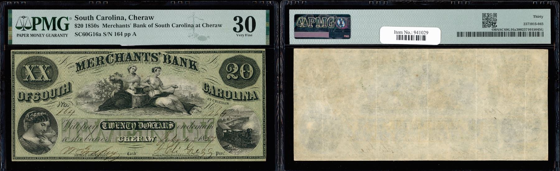 Cheraw, South Carolina - Merchants' Bank of South Carolina $20 July 4, 1857 G16a Sheheen 276 PMG Ver